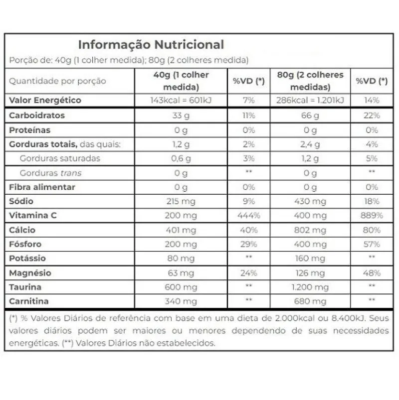 Endurance Extreme Energy (1kg) ENDURANCE EXTREME ENERGY é um suplemento alimentar composto por uma combinação de três fontes diferentes de carboidratos: Maltodextrina, Palatinose e Frutose, além de conter Taurina, L-Carnitina, vitamina c e os minerais: Sódio, Cálcio, Potássio e Magnésio. VITAFOR a Marca mais premiada e recomendada pelos profissionais de saúde do Brasil. Desde o início, trabalhando para promover a saúde através da nutrição e da suplementação. Benefícios - O magnésio auxilia no equilíbrio dos eletrólitos;- A vitamina C, o cálcio e o magnésio auxiliam no metabolismo energético;- O cálcio e o magnésio auxiliam no funcionamento muscular e neuromuscular;- A vitamina C auxilia no funcionamento do sistema imune, na formação do colágeno e é um antioxidante que auxilia na proteção dos danos causados pelos radicais livres;- O cálcio e o magnésio auxiliam na formação de ossos e dentes; - O cálcio auxilia na coagulação do sangue;- A vitamina C auxilia no metabolismo de proteínas e gorduras e o magnésio no metabolismo de proteínas, carboidratos e gorduras.- Contém taurina, L-carnitina e triglicerídeos de cadeia média - TCM (veículo);- Três diferentes fontes de carboidratos: Maltodextrina, Palatinose e Frutose,- 200 mg (444% da IDR) de Vitamina C por porção de 40g;- Fonte de minerais: cálcio, fósforo, potássio e sódio.
