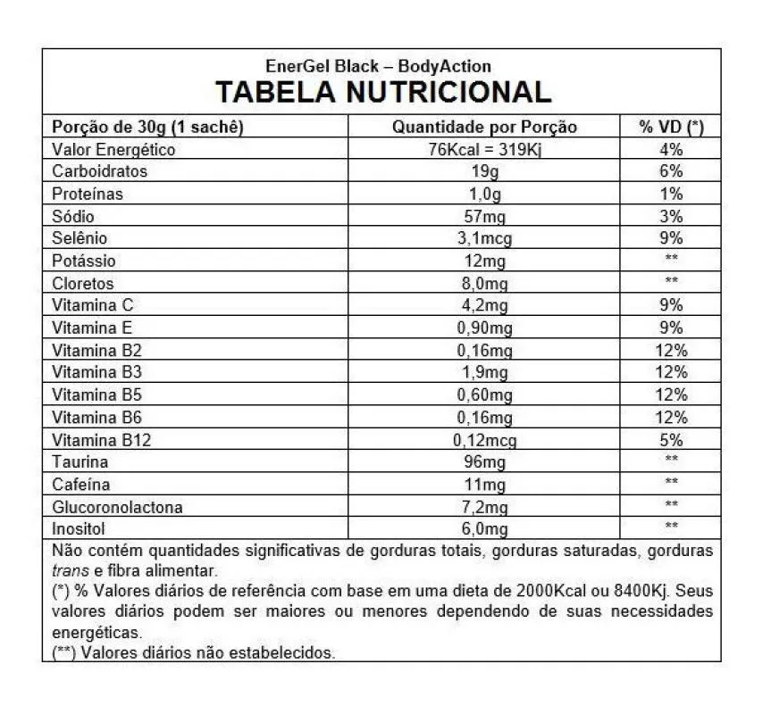 ENERGEL BLACK - BODY ACTION Energel Black é formulado com um mix completo de carboidratos em suas diferentes formas, como a Palatinose, Frutose, D-Ribose e Waxy Maize, que garantem o aporte energético ideal para antes, durante e depois das atividades físicas. Sua absorção de forma gradual e contínua, retarda a fadiga precoce e mantém a reposição de glicogênio muscular. Adicionado de eletrólitos, mantém o equilíbrio isotônico garantindo um melhor desempenho e recuperação. Contém cafeína, que mantém o estado de alerta ativo e ainda dá o pique necessário para o melhor rendimento nas atividades. Energel BLack é indicado para atletas de todas as modalidades esportivas que necessitam de uma boa fonte de energia para otimizar a performance durante o treinamento ou competição. Por estar na forma de gel, favorece uma absorção equilibrada, evitando o desconforto que pode ser causado pela sensação de estômago pesado.BENEFÍCIOS: * Repositor energético em gel de fácil consumo;* Contém eletrólitos para equilíbrio isotônico;* Rico em carboidratos simples e complexos (Palatinose, Frutose, D-Ribose e Waxy Maize);* Contém 11mg de cafeína por sachê;* Ideal para melhorar energia, foco e explosão muscular;* Contém whey protein Isolado e Concentrado na formulação;* Enriquecido com vitaminas e minerais com importante ação antioxidante;* Não contém glúten.