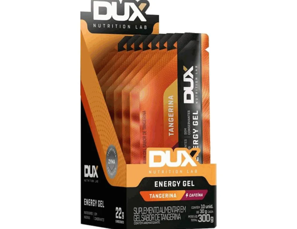 Energy Gel Display (10 unid 30g) O Energy Gel Dux, foi desenvolvido com a com tecnologia enzimática exclusiva Zyma, otimizando assim sua absorção e utilização pelo organismo. Além disso, sua textura única foi projetada para tornar o consumo ainda mais fácil e agradável. Eficiência e Performance - Sua fórmula combina carboidratos com diferentes taxas de absorção, garantindo energia que você precisa durante os treinos e competições, além de uma maior concentração de carboidratos em menor volume e uma textura que facilita seu consumo: 22g de carboidratos em 30g (de produto). Experiência Superior - O Energy Gel Dux é a escolha ideal para quem busca praticidade durante os treinos e competições. Sua embalagem compacta cabe facilmente no bolso, sendo de fácil abertura. Além disso, sua textura única e exclusiva não apenas facilita o consumo, mas também aprimora toda a experiência, proporcionando um produto que atende às suas necessidades de forma conveniente e deliciosa. Peso Molecular - A sacarose invertida enzimática apresenta um peso molecular inferior quando comparada à sacarose comum e outros tipos de carboidratos, como a maltodextrina. Esse aspecto favorece a absorção e a utilização rápida desses carboidratos pelo organismo, sendo crucial para manter o desempenho em exercícios de alta intensidade e longa duração. Clean Label - Fórmula rigorosamente limpa e pura, feita exclusivamente com ingredientes naturais e sem conservantes, para potencializar seu desempenho. Benefícios: - Fornecimento constante de energia; - Melhor digestibilidade; - Redução da fadiga.