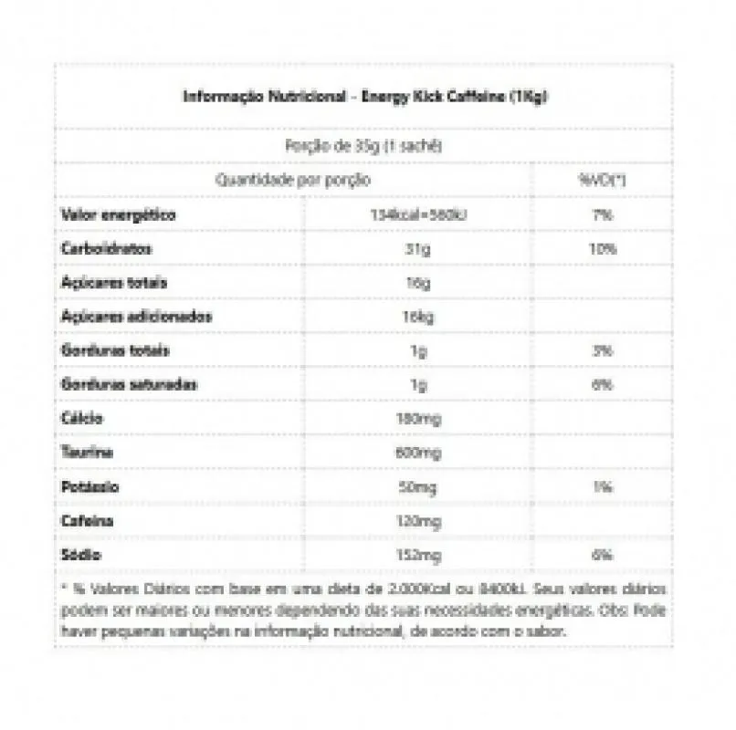 Energy Kick Caffeine c/ Palatinose Sachê (35g) DUX ENERGYKICK é um pré e intra treino para esportes de alta performance, que oferece um aporte imediato e duradouro de energia, para resultados superiores em treinos e competições. Sua fórmula contém diferentes tipos de carboidratos (Palatinose, Maltodextrina e Frutose [2:1:1]), proporciona maior resistência física com TCM (triglicerídeos de cadeia média), auxilia o foco com taurina, promove a hidratação com uma mistura excepcional de eletrólitos e possui uma dose especial de 120mg de diferentes cafeínas. BENEFÍCIOS: * Alta disponibilidade energética, por até 30 minutos, originada por carboidratos de três fontes distintas: Palatinose, Frutose, Maltodextrina, e 1.000mg de TCM (triglicerídeos de cadeia média);* Os carboidratos são simultaneamente absorvidos por diferentes sistemas do organismo (intestino delgado, grosso e estômago), enquanto o TCM é digerido em velocidade menor;* Combinação equilibrada e completa de eletrólitos com múltiplas funções;* O TCM aumenta a utilização de gordura como fonte energética e é absorvido mais lentamente, mantendo a resistência física quando os níveis de energia dos carboidratos estiverem acabando;* 600mg de taurina para aumentar o foco, e dar suporte a diversas funções críticas do corpo;* A cafeína ZumXR®, tem liberação dupla, oferecendo um estímulo imediato e outro que se mantém progressivamente por até 3 horas. São 120mg para maior performance e para combater a fadiga até o fim do exercício;* Fórmula avançada, desenvolvida para esportes de alto rendimento como triathlon, ciclismo, corrida, lutas, crossfit e powerlifting;* Produto vegano, feito com corantes naturais funcionais e adoçado com stévia;* Sem substâncias ilícitas, lactose, ingredientes modificados geneticamente ou qualquer ingrediente inferior;* Fornece suporte aos três principais momentos do atleta de alto rendimento: hidratação, energia e recuperação.