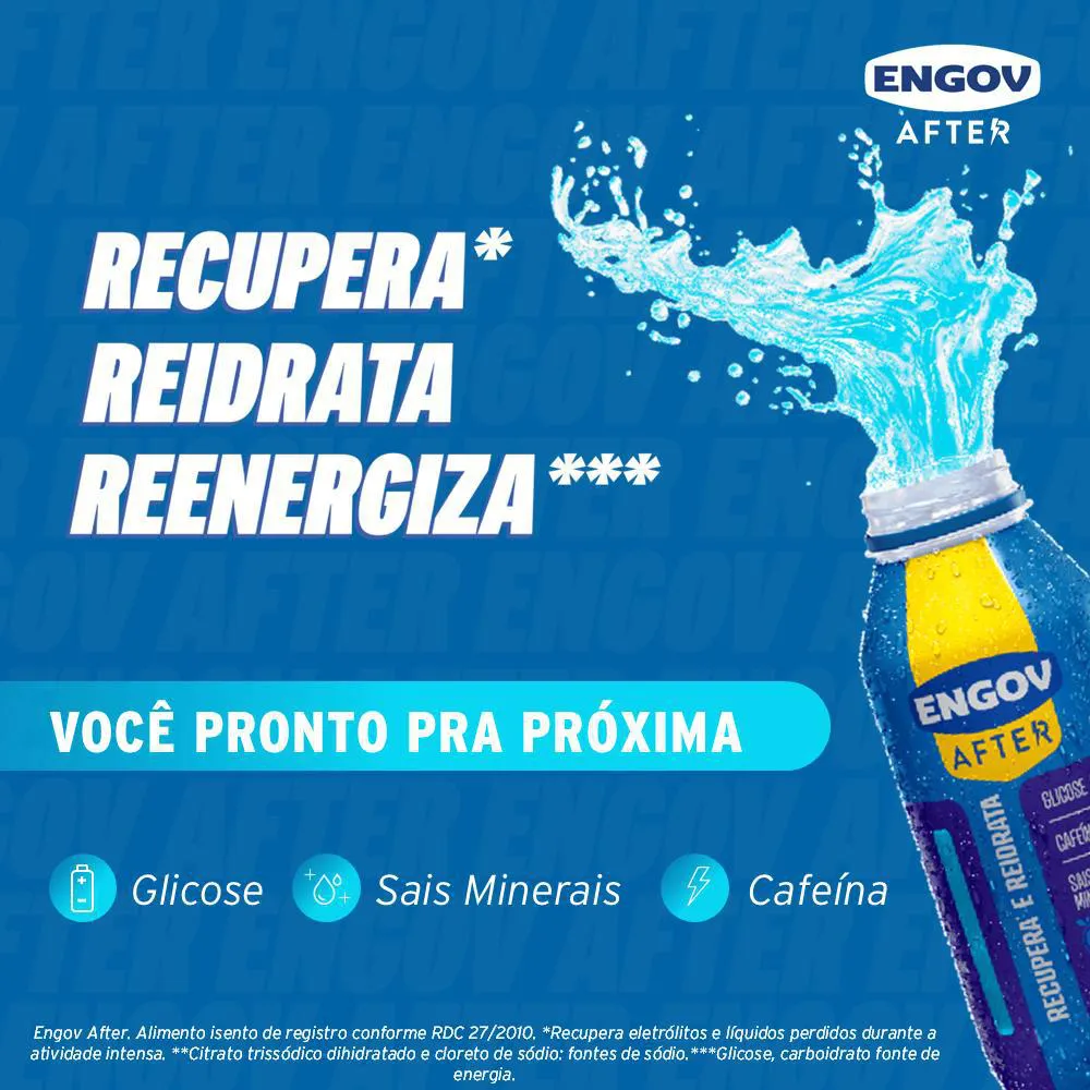 Engov After é um novo conceito de bebida que recupera, reidrata e reenergiza, dando aquele UP quando você precisa. Engov After. Alimento isento de registro conforme RDC 27/2010.