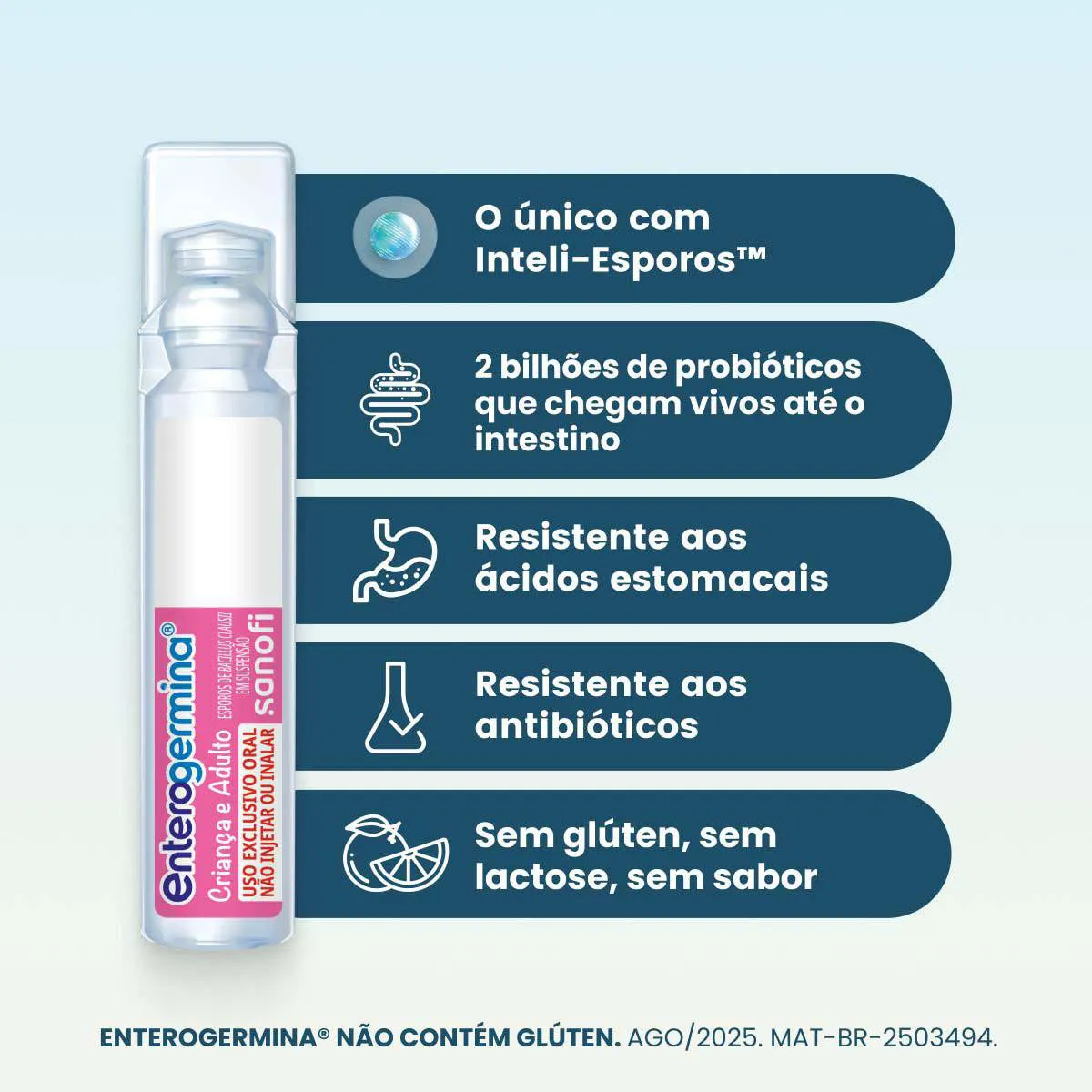 Enterogermina é um probiótico líquido pronto para beber, indicado para pessoas com desconforto intestinal. Cada flaconete contém cerca de 2 bilhões de esporos de Bacillus clausii, microrganismos benéficos que ajudam a equilibrar a flora intestinal, melhorar a digestão e fortalecer o sistema imunológico. O consumo deve estar associado a uma alimentação equilibrada e hábitos saudáveis.