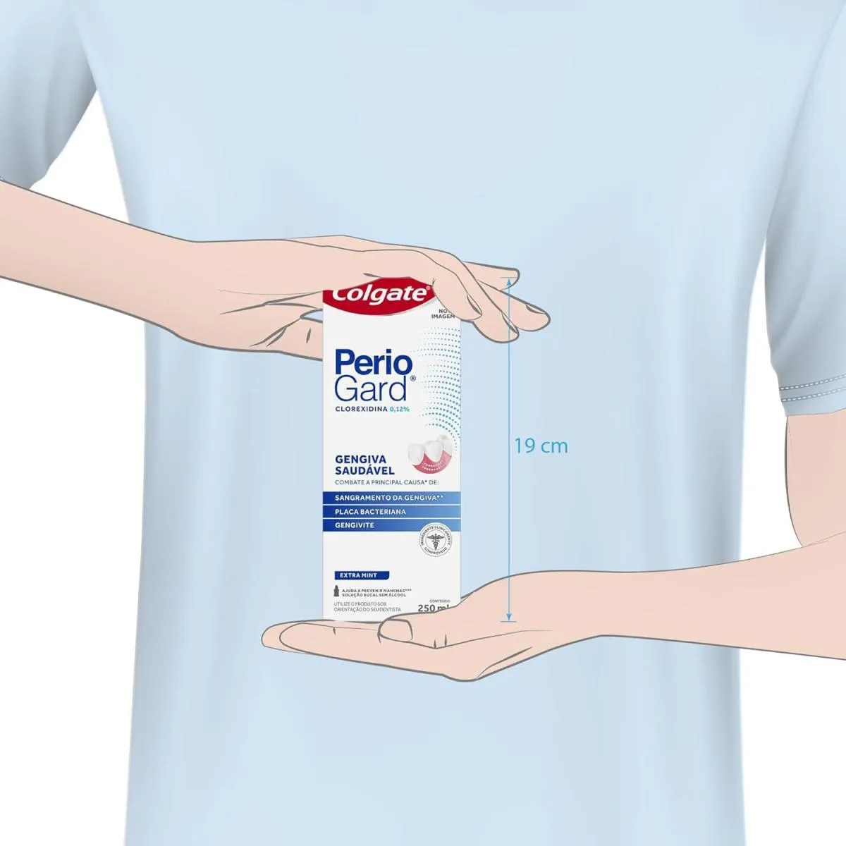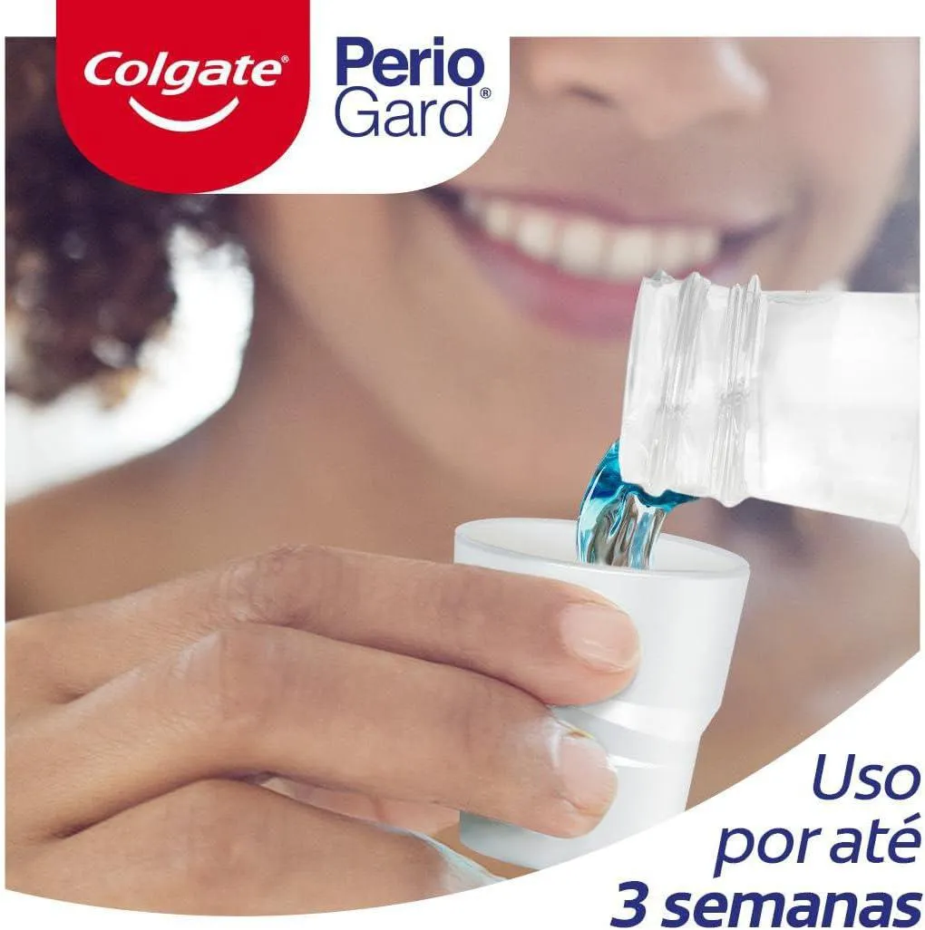 - Colgate PerioGard Extra Mint é uma solução bucal antibacteriana sem álcool, com ação segura e comprovada. - Age contra os germes que causam mau hálito e a progressão de doenças periodontais (inflamações e infecções da gengiva). - À base de Gluconato de Clorhexidina a 0,12%, é altamente eficaz no combate às bactérias causadoras da gengivite. - Também garante 48% menos sangramentos e até 54% menos placa bacteriana. - Sabor agradável de menta. - Encher a tampa de Colgate Periogard Extra Mint até a linha tracejada (15ml) e realizar bochechos por 30 segundos.