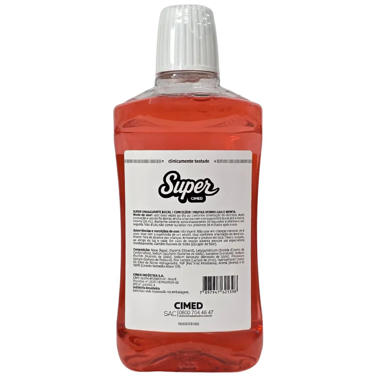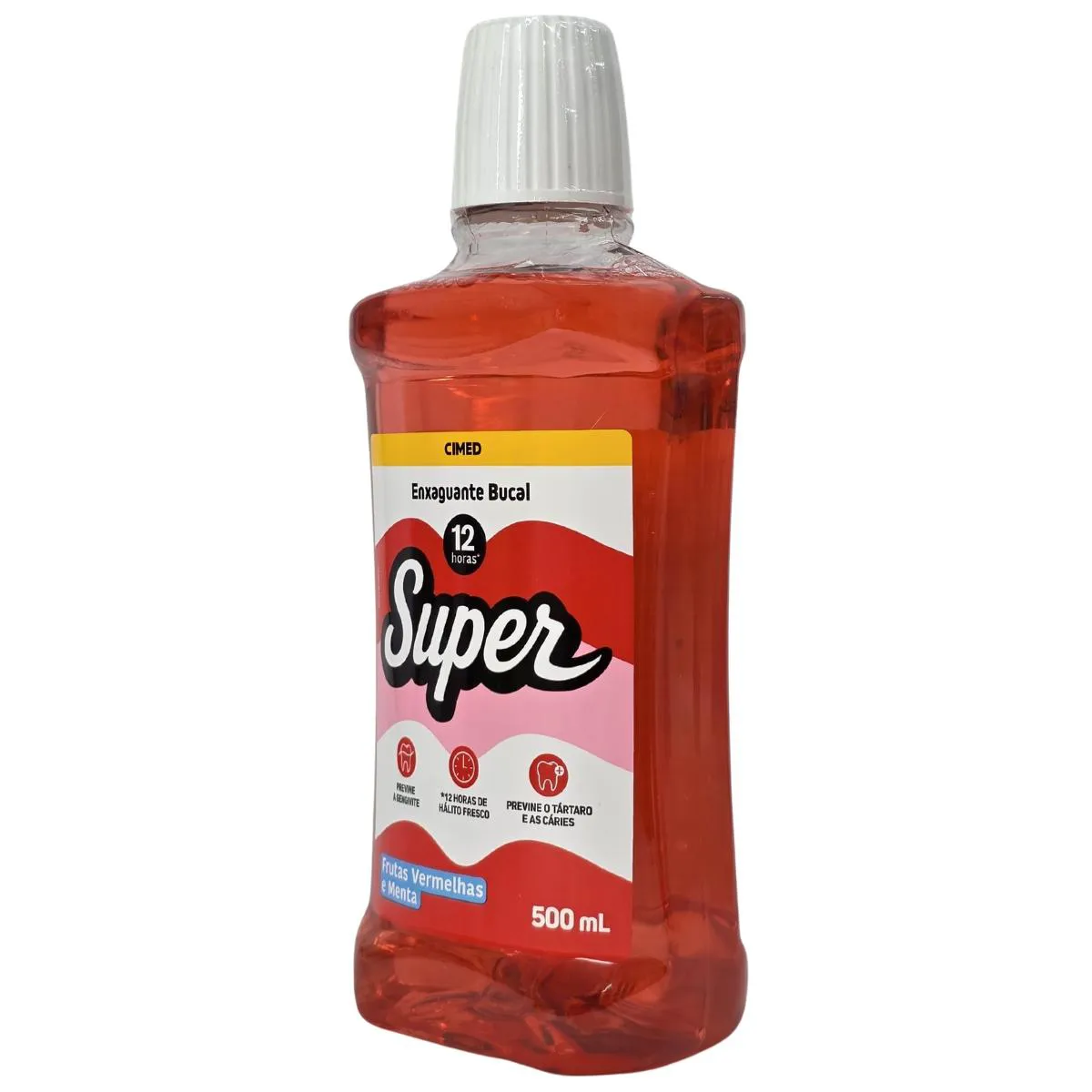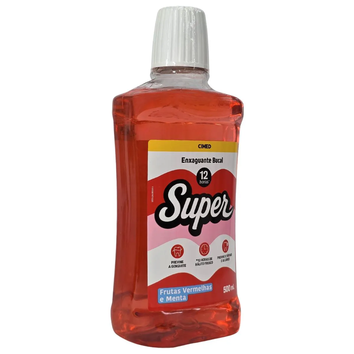 Finalidade: O Enxaguante Bucal Super Cimed de Frutas Vermelhas com Flúor é um aliado para a higiene diária, oferecendo proteção anticáries, combate à placa bacteriana, redução do mau hálito e fortalecimento do esmalte dental, com sabor refrescante e fórmula sem álcool, ideal para uso após escovação e fio dental, proporcionando uma sensação de boca limpa por mais tempo, especialmente as versões "12h de Proteção.