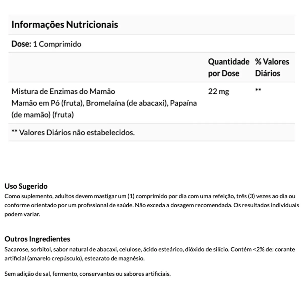 ATENÇÃO Produto original importado Produto disponível no Brasil As enzimas digestivas são essenciais para a absorção do corpo e a plena utilização dos alimentos. A capacidade do corpo de produzir enzimas diminui com a idade e, consequentemente, a eficiência da digestão diminui. BENEFÍCIOS: v Suplemento v Auxílio Digestivo v Sem Glúten SUGESTÃO DE USO: Tomar um (1) comprimido por dia com uma refeição, três (3) vezes ao dia.