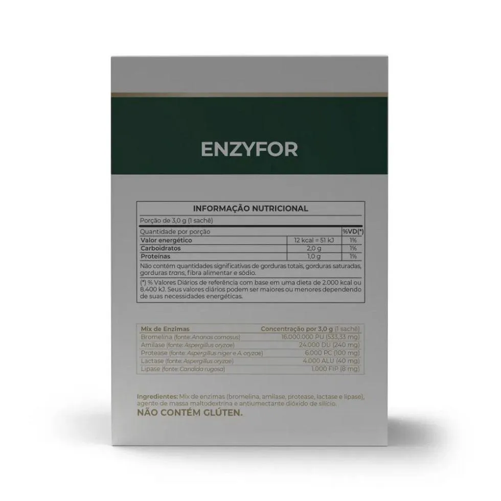 ENZYFOR (Sachê 3g avulso) - VITAFOR Enzyfor da Vitafor é um produto com exclusivo mix de enzimas, indicado para o preparo de alimentos, como bebidas, alimentos proteicos e alimentos lácteos, auxiliando no processo de digestão desses. Composto por 5 enzimas digestivas de alta qualidade, essenciais para digestão (Amilase, Protease, Lactase, Lipase, Bromelina), o Enzyfor auxilia o sistema digestivo, evitando quadros de desequilíbrio da flora bacteriana intestinal, alergias, abusos alimentares e deficiências de digestão. BENEFÍCIOS * Possui enzimas digestivas para o preparo de alimentos;* Qualidade digestiva e desintoxicação corporal;* Contém mix de enzimas: protease, lactase, lipase, bromelina e amilase;* Formato sachê. Embalagem disponível: Sachê 3g de suplemento na forma de pó avulso.