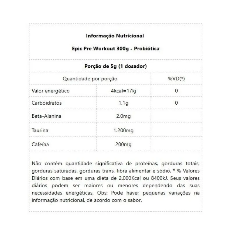 Epic Pre Workout (300g) Epic é o Pré-treino da Probiótica que conta com um sinergismo de ingredientes, que tem o intuito de promover melhora de performance esportiva. Conta em sua composição com a presença dos ativos: Beta Alanina, Taurina e Cafeína, em quantidades satisfatórias para promover melhora da disposição, desempenho físico e redução da fadiga. * Cafeína no Esporte: Devido sua ação no sistema nervoso central que promove um estado de alerta, tem-se uma diminuição da sensação de esforço; aumento da disposição para o treinamento, e, ainda, melhora a contração da musculatura. * Beta-Alanina no Esporte: A beta alanina age aumentando as concentrações musculares de carnosina, que tem ação tamponante, neutralizando os íons H+, e atuando de forma positiva no desempenho esportivo, principalmente em exercícios de alta intensidade e curta duração. * Taurina no Esporte: A taurina também age na cognição e melhora de energia. Estudos evidenciaram aumento no desempenho em testes contra-relógio pela ingestão aguda ou crônica de taurina, 1-2 horas antes do treino, melhorando, inclusive, a sensibilidade à insulina e aumento da lipólise. Benefícios: - 2g de Beta Alanina;- 200mg de Cafeína;- 1.200mg de Taurina;- Mais resistência;- Melhor desempenho esportivo;- Foco e concentração;- Retardamento da Fadiga;- Neutraliza a sensação de queimação muscular.