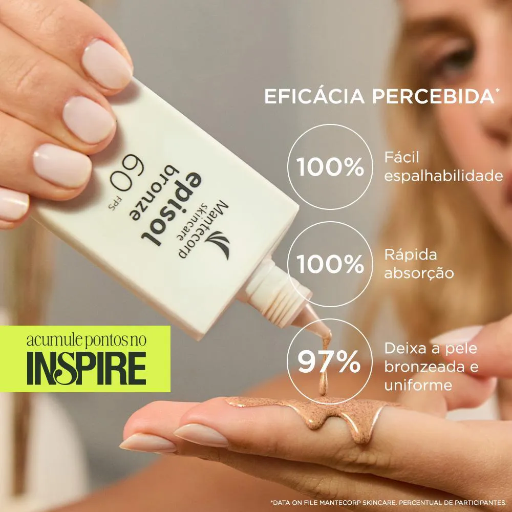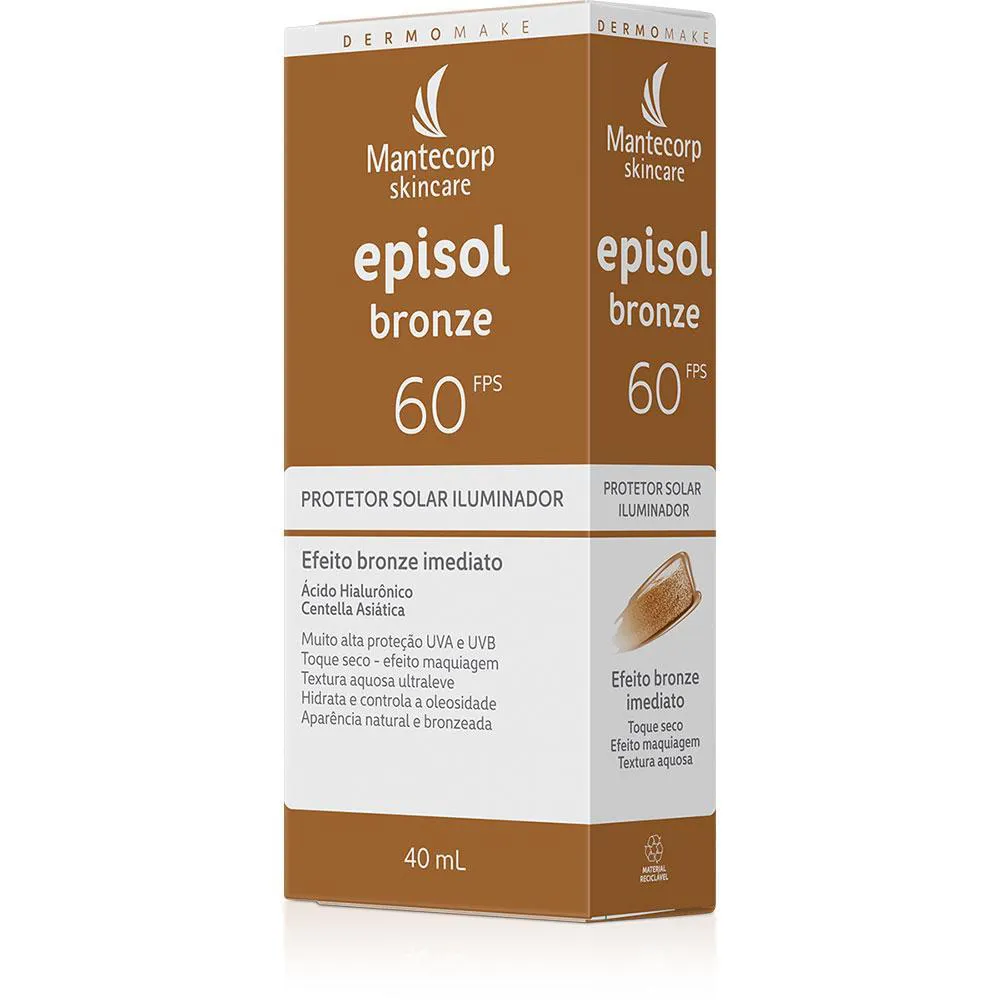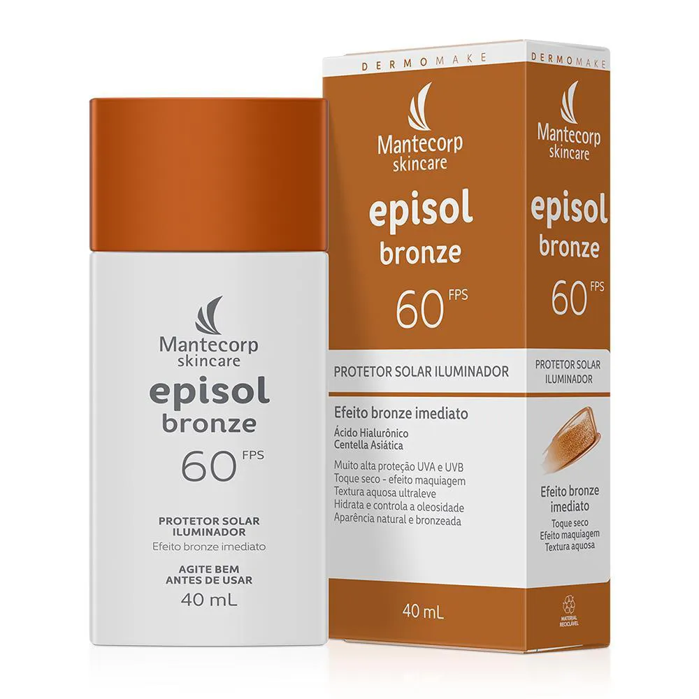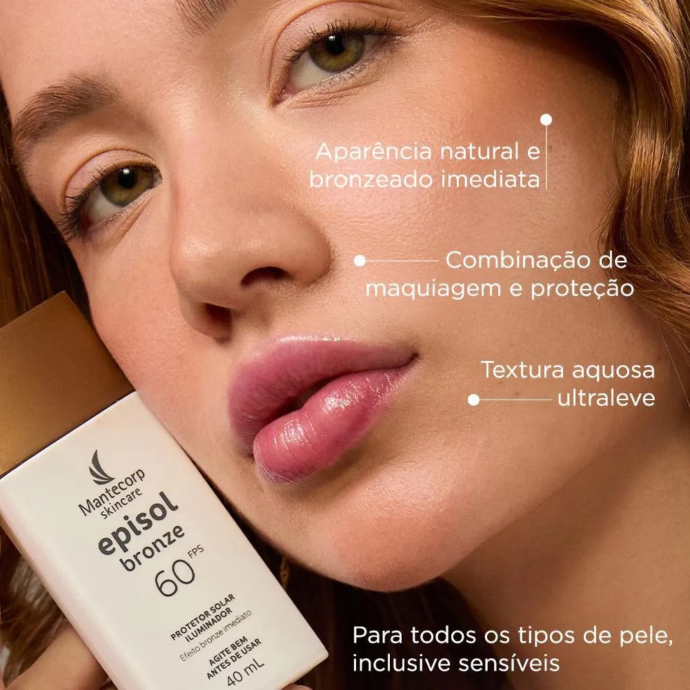 EPISOL BRONZE FPS 60 é um protetor solar iluminador com textura ultraleve e base aquosa, oferecendo rápida absorção e toque seco. Ideal para todos os tipos de pele, incluindo as sensíveis. Com pigmento, proporciona um efeito bronze natural sem necessidade de exposição ao sol. Não é um autobronzeador.
