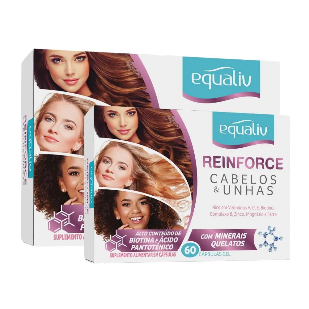 Equaliv Reinforce é um suplemento vitamínico com minerais quelatos e alto conteúdo de biotina e ácido pantotênico, que auxilia no fortalecimento dos cabelos e unhas.