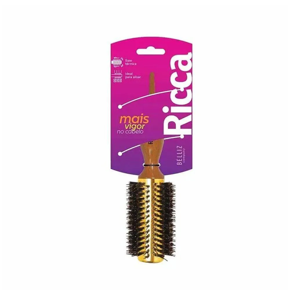 Escova de Cabelo Base Térmica para Alisar Modelar Ricca 36A Escova de Cabelo Base Térmica Ricca 36 auxilia na modelagem e alisamento dos fios. Seu formato facilita o manuseio e permite criar penteados com volume, cachos definidos ou lisos perfeitos. A base térmica distribui o calor uniformemente, reduzindo o tempo de secagem e proporcionando resultados mais duradouros. Pode ser utilizada em cabelos secos ou úmidos, ideal para finalizar penteados ou modelar os fios no dia a dia.As cerdas da escova desembaraçam e alinham os fios durante o processo de modelagem, minimizando a quebra e o frizz. A base térmica retém o calor, permitindo que os fios sejam modelados com mais facilidade e fixação. O cabo ergonômico proporciona maior conforto e controle durante o uso. A escova é leve e compacta, facilitando o transporte e armazenamento.Benefícios:- Redução do tempo de secagem.- Facilidade na modelagem dos fios.- Criação de penteados diversos (lisos, cachos, volume).- Minimiza frizz e quebra.- Cabo ergonômico para maior conforto.- Leve e compacta.Código: 118072Referência: 418Marca: RiccaPeso: 300gCor: BegeMaterial: MadeiraDimensões do produto (AxLxC): 7,00x7,00x24,00cmConteúdo da embalagem: 1 Escova térmica