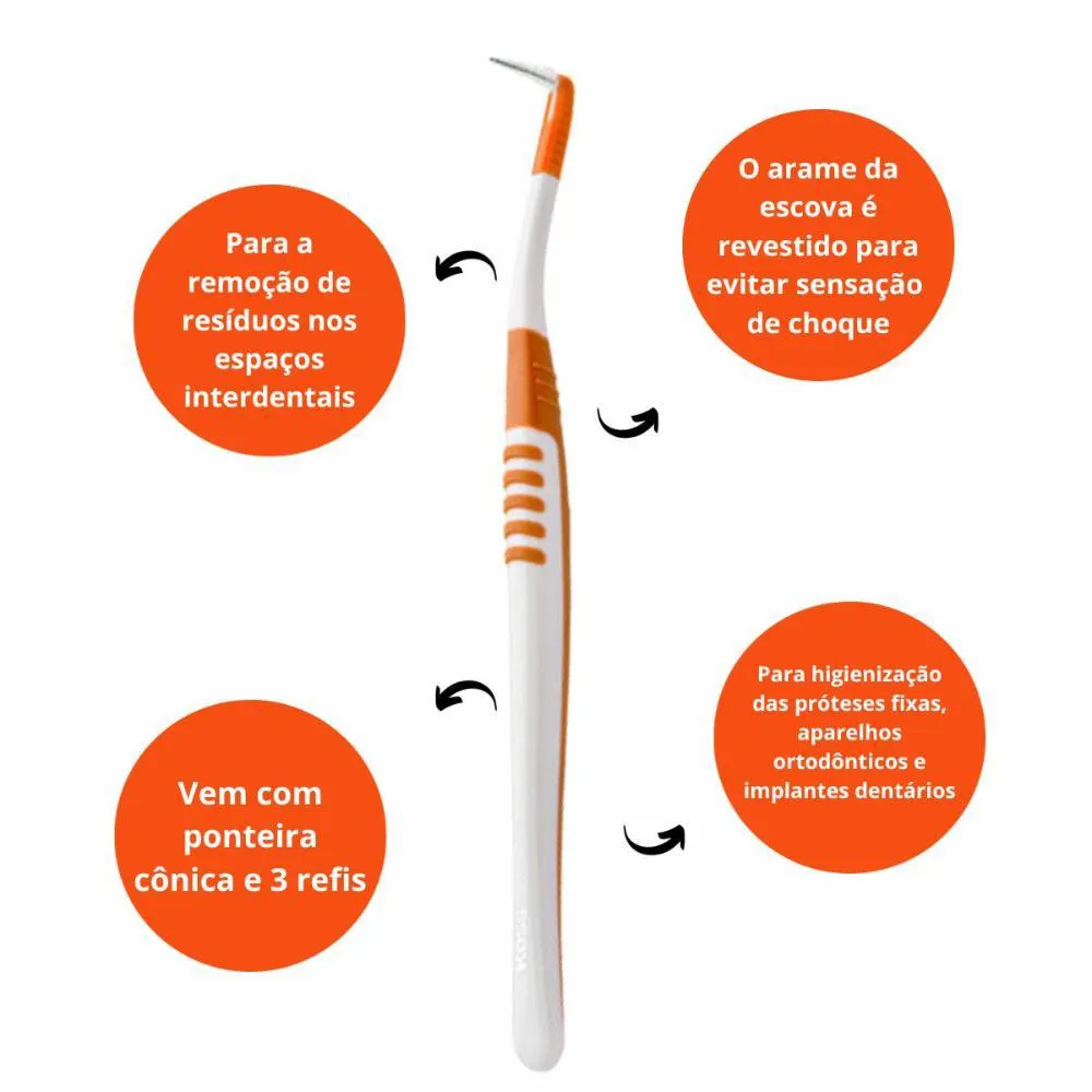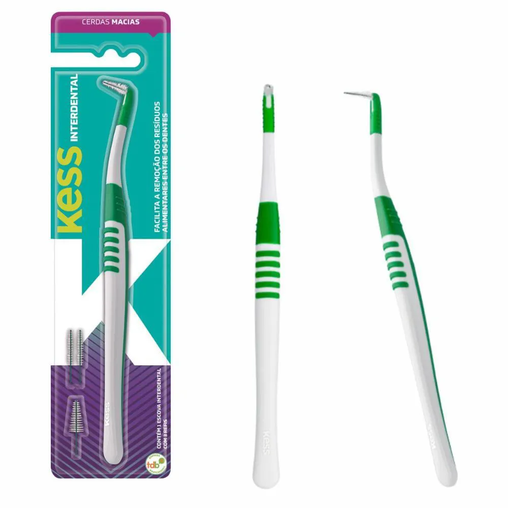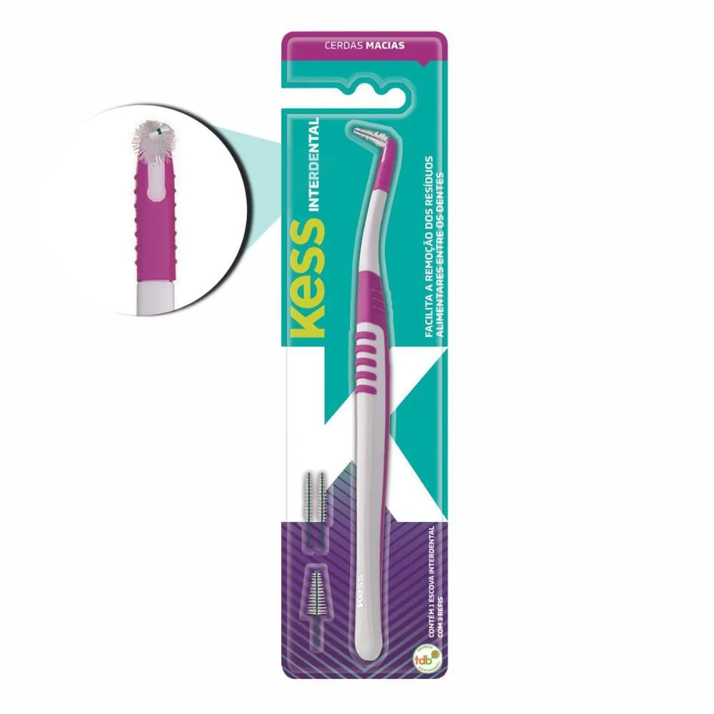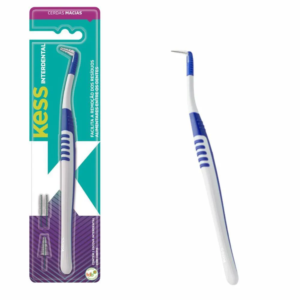 Escova Interdental A Escova Interdental Kess foi especialmente desenvolvida para a remoção de resíduos alimentares nos espaços interdentais. É indicada para higienização das próteses fixas, aparelhos ortodônticos e implantes dentários. O arame da escova é revestido para evitar uma possível sensação de choque. Vem com ponteira cônica e 3 refis: 1 com ponteira cônica e 2 com ponteira cilíndrica. . Tempo de Uso As escovas dentais devem ser substituídas a cada três meses após o início do uso ou conforme a orientação do dentista. Com o tempo, as cerdas perdem a flexibilidade, impossibilitando a higienização correta e ocasionando assim o acúmulo de placa bacteriana. . Composição Escova dental com cabo de material plástico, injeção de borracha e refis de nylon com fio de aço revestido. . Contém: -01 Escova interdental com ponteira cônica. -02 refis interdentais cilíndricos. -01 refil interdental cônico. . ***ENVIADAS CONFORME A DISPONIBILIDADE DAS CORES