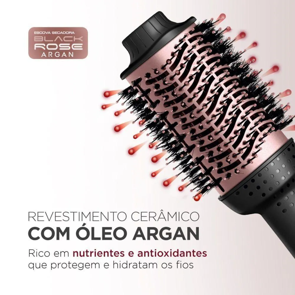 Escova Secadora Mondial Argan 3 em 1 1200W - Black RoseA Escova Secadora Mondial Argan é o produto perfeito para cuidar dos seus cabelos de forma prática e eficiente. Com ela, você pode secar, alisar e modelar os fios usando apenas uma mão, proporcionando um resultado de salão com muito mais praticidade no seu dia a dia.Principais Características:Revestimento com Óleo de Argan: As cerdas possuem um revestimento especial com óleo de argan, um ingrediente rico em nutrientes e antioxidantes que protege e hidrata os cabelos durante o uso, garantindo fios mais saudáveis.3 em 1: Seca, Alisa e Modela: Combina o poder de um secador com a facilidade de uma escova. Com um único movimento, você seca, alisa e modela os cabelos, otimizando seu tempo.Alta Potência e 3 Temperaturas: Com 1200W de potência, a escova oferece uma secagem rápida e eficiente. As 3 variações de temperatura permitem que você ajuste o calor ideal para o seu tipo de cabelo.Design Oval com Cerdas Mistas: O formato oval facilita a escovação, sendo perfeito para alisar e dar volume. As cerdas mistas alinham e modelam os fios ao mesmo tempo, proporcionando um resultado incrível.Bivolt Chaveado: Ideal para levar em viagens, pode ser utilizada tanto em tomadas 110V quanto em 220V. Basta ajustar a chave seletora e usar sua escova em qualquer lugar.