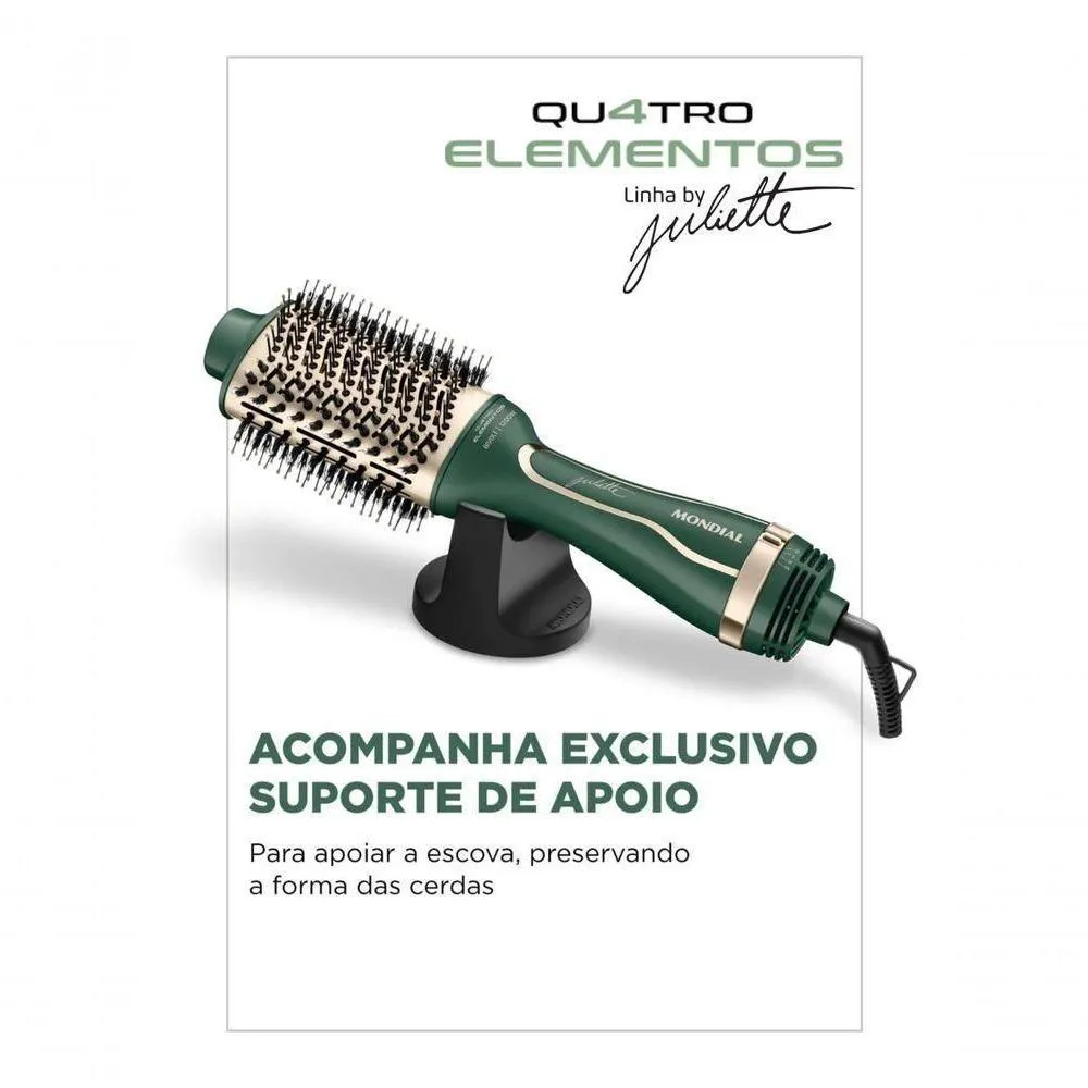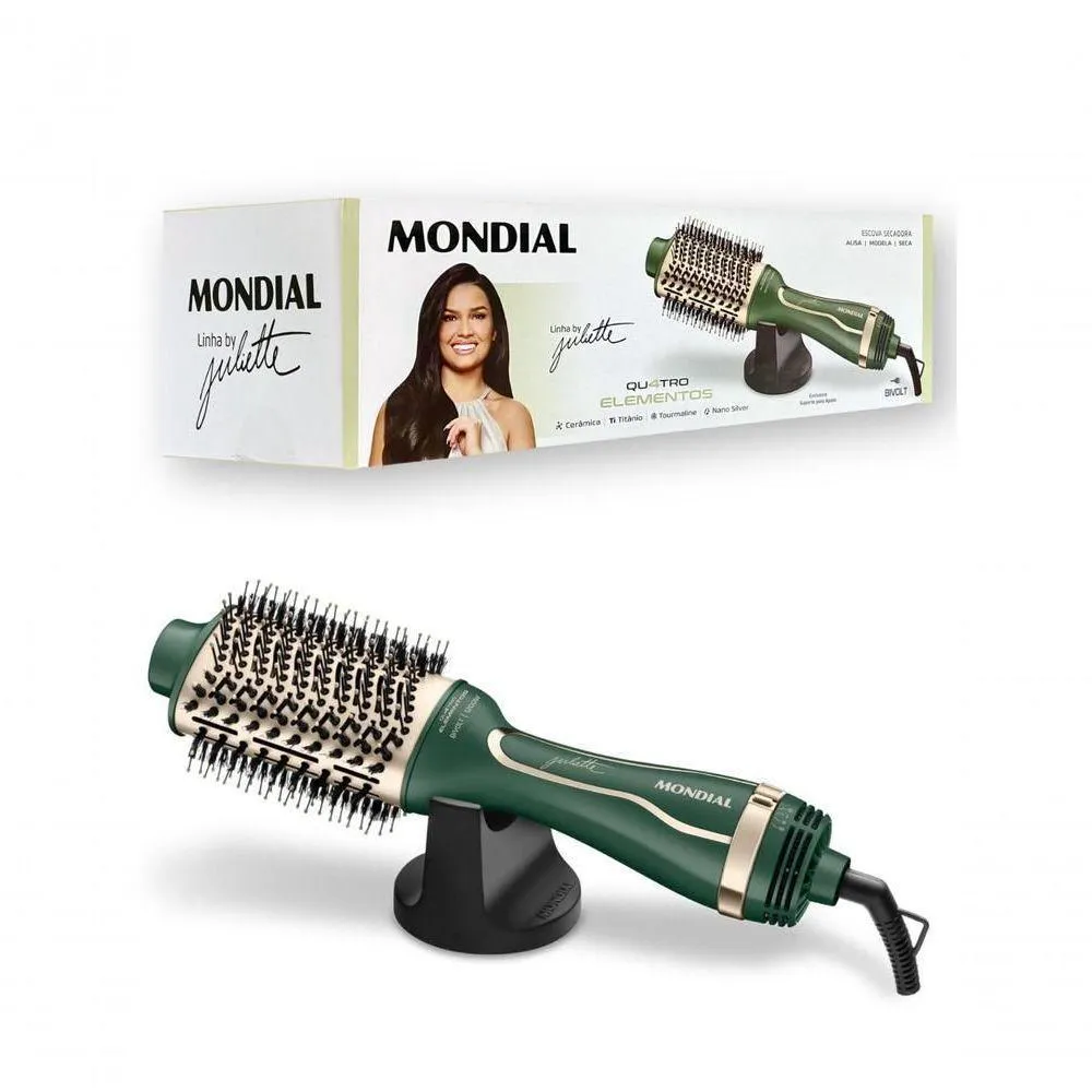 Escova Secadora Mondial by Juliette 1300W Verde Oliva - ES-JU-02A Escova Secadora da Linha by Juliette Qu4tro Elementos traz um revestimento especial enriquecido com infusão de Cerâmica, Titânio, Tourmaline e Nano Silver. Juntos, esses 4 elementos protegem seus fios e garantem uma aparência mais saudável aos cabelos, com brilho intenso, maciez e sem frizz.Principais Características:Revestimento Especial Qu4tro Elementos: A fusão de Cerâmica, Titânio, Tourmaline e Nano Silver distribui o calor uniformemente, protege os fios, reduz o frizz e garante um cabelo com brilho e aparência saudável.3 em 1: Seca, Alisa e Modela: Combina o poder do secador com a praticidade da escova. Você seca, escova e modela o cabelo ao mesmo tempo, com uma única mão, de forma rápida e fácil.Alta Potência e 3 Temperaturas: Com 1300W de potência para uma secagem eficiente, possui 3 opções de ajuste para garantir o resultado que você deseja em diferentes tipos de cabelo.Design Inteligente e Prático: O design oval facilita a escovação e a modelagem. O cabo giratório de 2,5 metros garante mais liberdade de movimento, e a escova acompanha um suporte de apoio exclusivo para preservar as cerdas.Bivolt Chaveado: Ideal para levar em viagens, pode ser utilizada em ambas as voltagens (110V e 220V). Basta ajustar a chave seletora e usar sua escova em qualquer lugar.