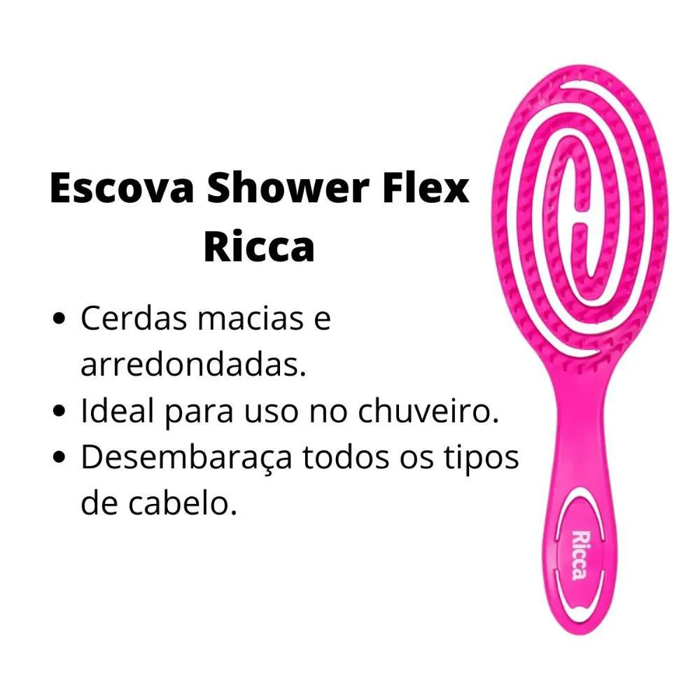 Ricca Shower Flex Rosa Escova de cabelo Ricca Shower Flex desembaraça os fios molhados com facilidade desfazendo os nós e diminuindo a quebra dos fios, sendo ideal para espalhar o condicionador ou cremes durante o banho. A Escova de Cabelo Ricca Shower Flex com com cerdas arredondadas e uma base aberta e flexível que acompanha a curvatura da cabeça proporcionando uma massagem saudável no couro cabeludo. Pode ser usada em todos os tipos de cabelos, principalmente os cacheados. Conselho de Aplicação: Separe mechas pequenas e inicie desembaraçando o cabelo das pontas para a raiz. Comece sempre desembaraçando as pontas, onde geralmente se concentram os nós. Quando as pontas estiverem desembaraçadas, penteie todo o comprimento do cabelo. Aposte em movimentos suaves para não danificar os fios e garantir sensação de conforto. . Composição: Plástico.