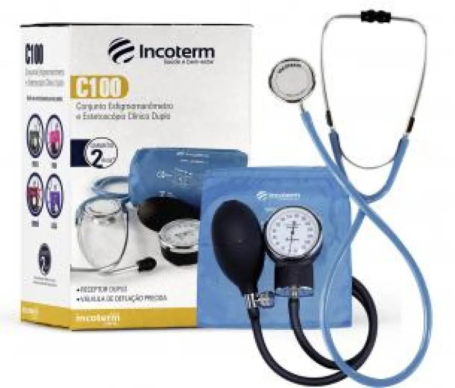 "DESENVOLVIDO PENSANDO NO ESTUDANTE E NO TECNICO DA AREA DA SAUDE, O CONJUNTO ESTETOSCOPIO CLINICO DUPLO (EC100) E ESFIGMOMANOMETRO ANEROIDE (EA100) C100 INCOTERM E DE FACIL UTILIZACAO, ALEM DE PRATICO, COMPACTO E COM UMA EXCELENTE RELACAO CUSTO-BENEFICIO.