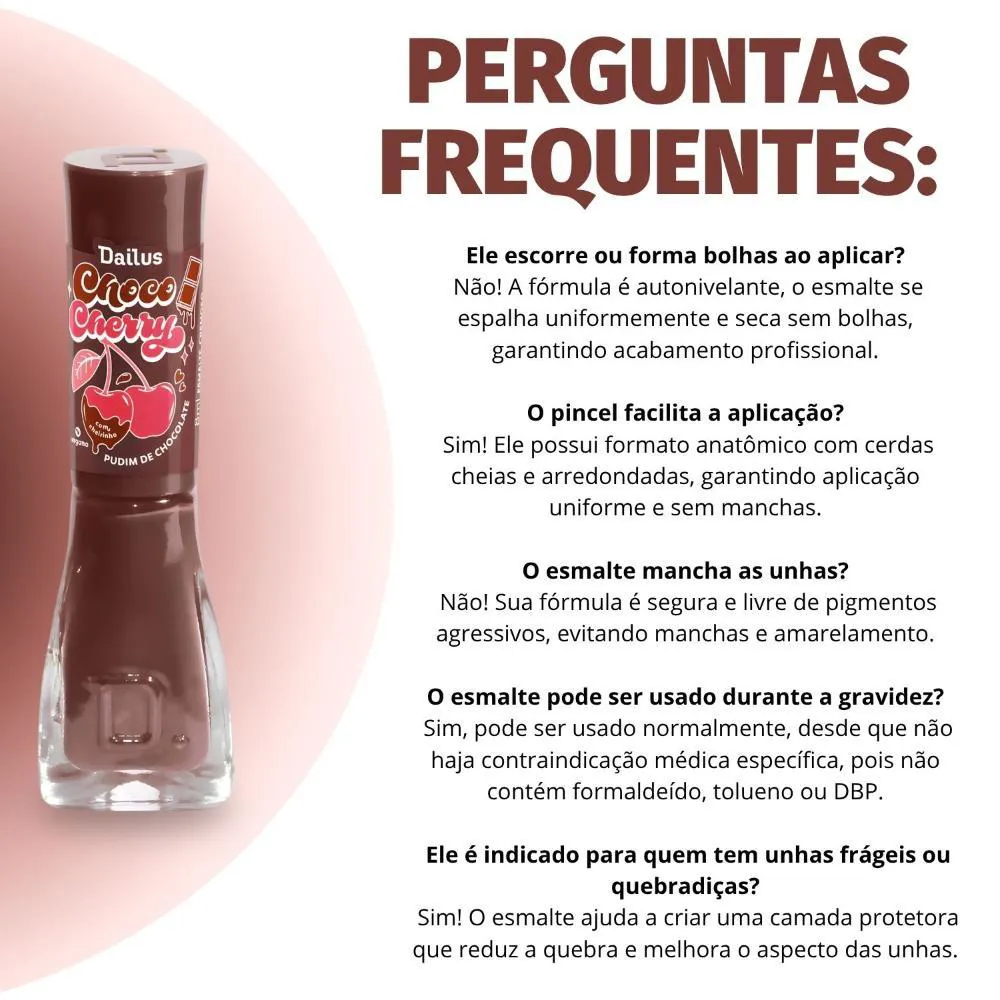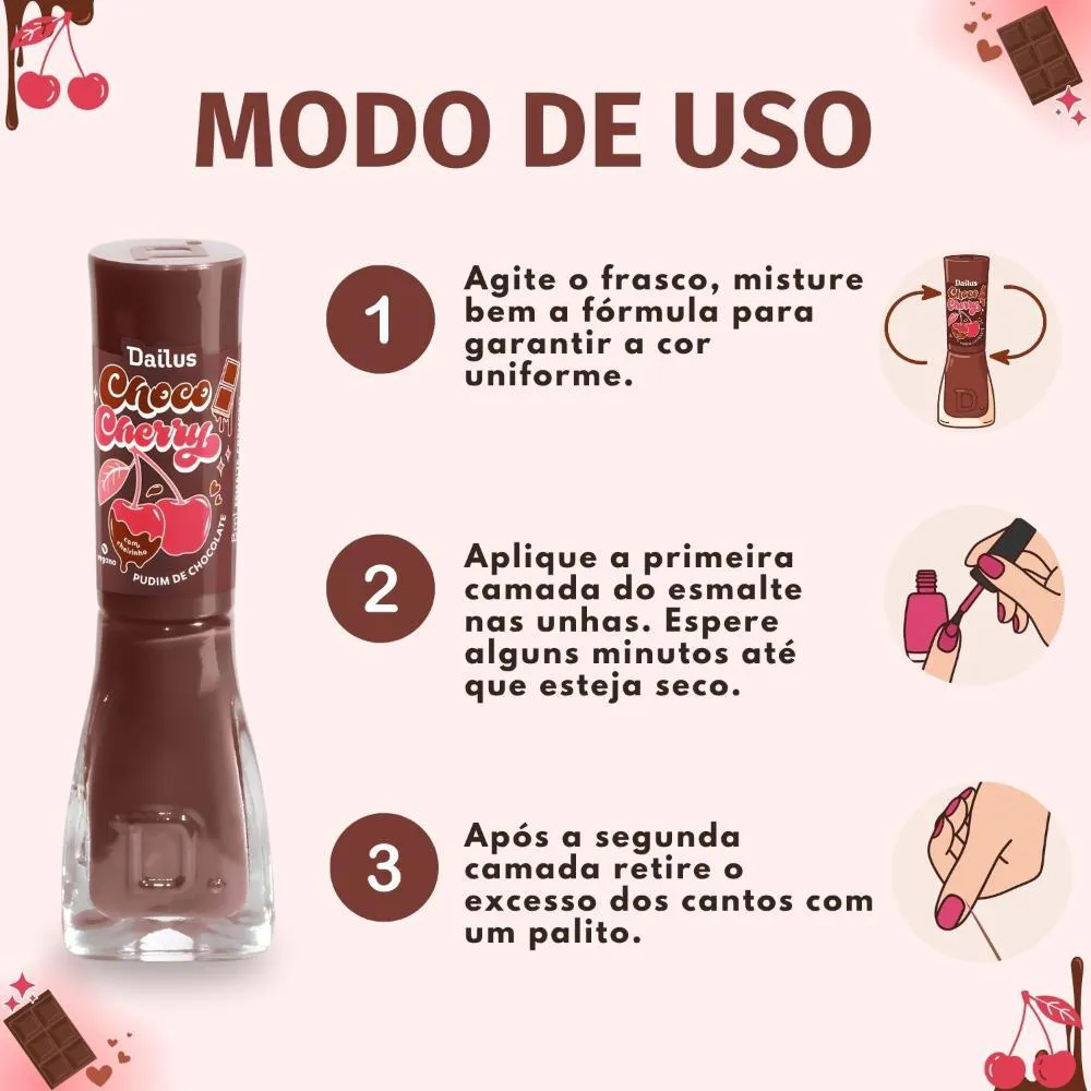 O Esmalte Cremoso Dailus Choco Cherry Pudim De Chocolate é ideal para o dia a dia, eventos sociais ou profissionais, e qualquer ocasião em que se deseje um visual elegante e discreto, mas com um toque de personalidade. Perfeito para quem aprecia tons terrosos e envolventes.Modo de Uso/Aplicação