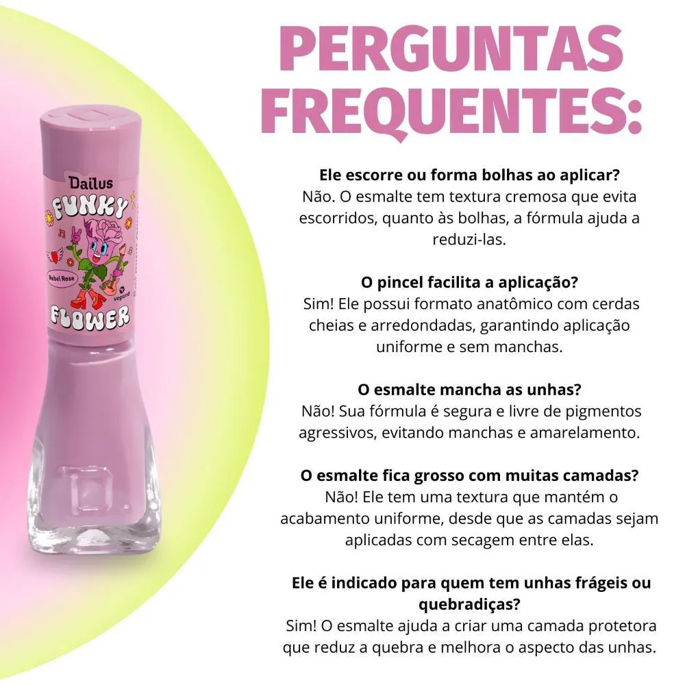 Descubra a vivacidade do Esmalte Cremoso Dailus Funky Flower 8ml, um toque de cor em tons pastéis que transformam suas unhas. Parte da encantadora coleção Funky Flower, este esmalte é a chave para expressar sua individualidade com um toque de cor e sofisticação. Não só oferece um acabamento cremoso e um brilho intenso, mas também garante longa duração e secagem rápida. Ideal para quem busca beleza e praticidade, sua fórmula é vegana e cruelty-free, alinhando cuidado e consciência em um só produto. Transforme suas unhas em uma tela de possibilidades e revele a beleza que reside em cada detalhe.Benefícios Principais