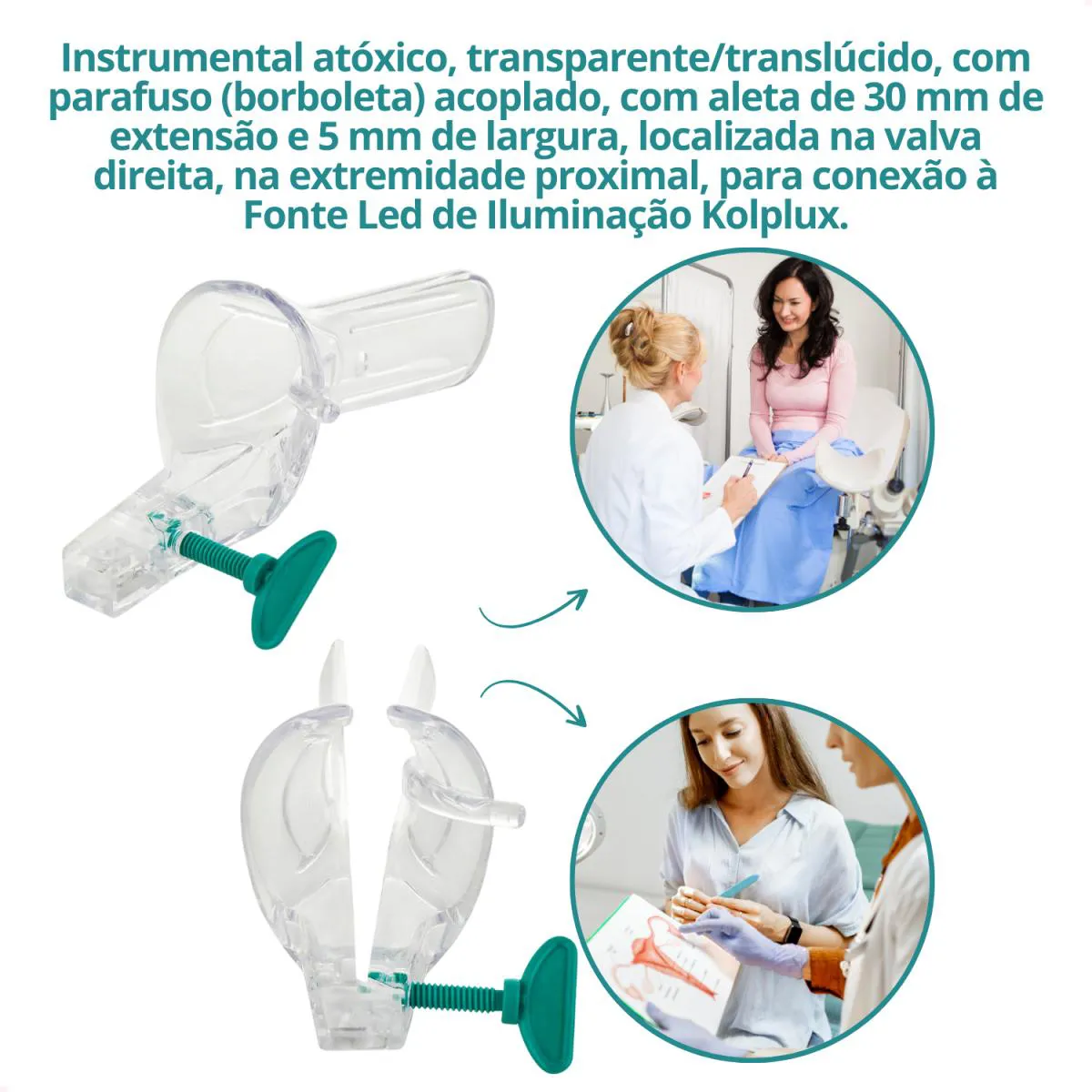 Instrumental atóxico, transparente/translúcido, com parafuso (borboleta) acoplado, com aleta de 30 mm de extensão e 5 mm de largura, localizada na valva direita, na extremidade proximal, para conexão à Fonte Led de Iluminação Kolplux.