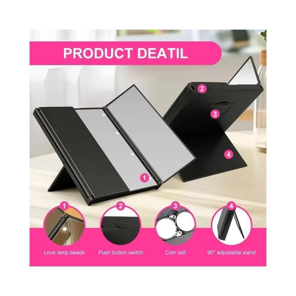 O espelho triplo perfeito para viajar a qualquer lugar com luzes LED que se distribuem uniformemente para que você possa fazer sua maquiagem mesmo no escuro com clareza na frente e na lateral do rosto.