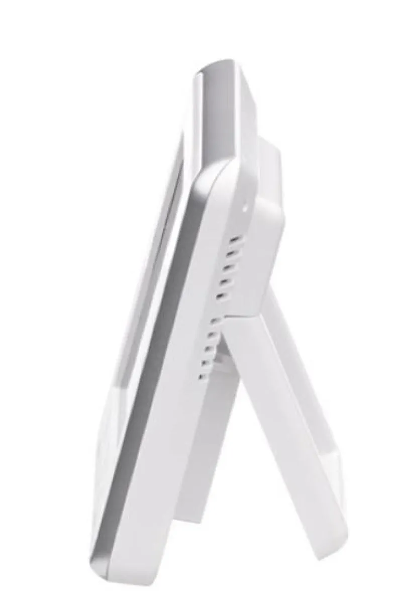 O visor claro facilita a localização: o clima da sala aparece na casa colorida sob a hora e a data. A temperatura externa e a umidade são marcadas com uma árvore estilizada e os símbolos mostram o clima atual.