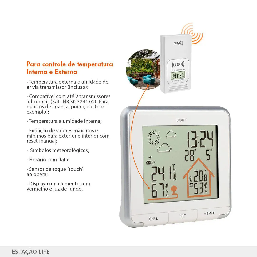 Os valores externos são determinados através de um transmissor de rádio separado, que é instalado ao ar livre em um local protegido. Com um alcance de até 60 m, eles transmitem os valores diretamente para a estação meteorológica LIFE.