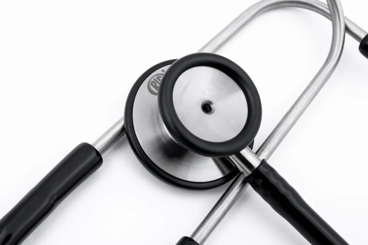 O estetoscópio é um instrumento médico profissional fabricado em aço inox, projetado com auscultador duplo para realizar exames de ausculta cardíaca e pulmonar. Serve para que profissionais de saúde possam realizar a escuta e avaliação precisa dos sons cardíacos e respiratórios de pacientes, permitindo o diagnóstico e monitoramento de condições clínicas através da captação de frequências cardíacas e pulmonares com alta sensibilidade acústica.