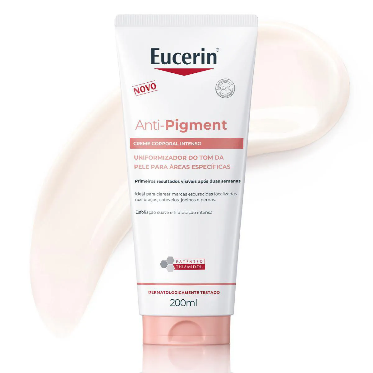 Eucerin Anti-Pigment é um creme corporal intenso para áreas específicas desenvolvido com Thiamidol, Ácido Lático, Dexpantenol e Ácido Hialurônico.