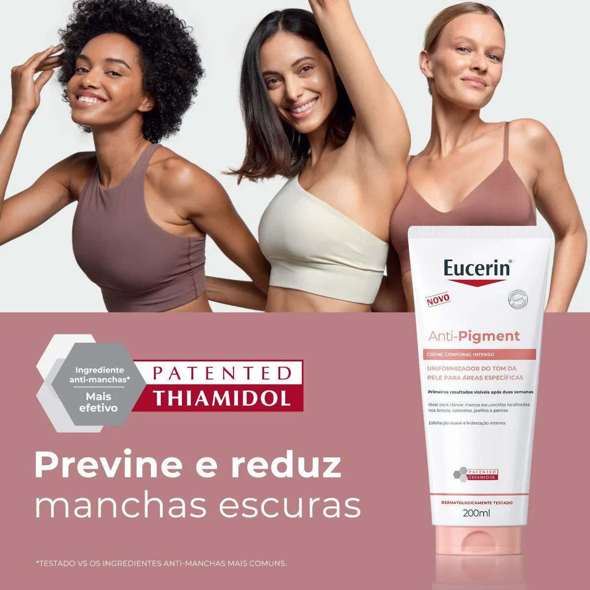 Indicado para todos os tipos de pele, o creme corporal Eucerin Anti-Pigment reduz efetivamente a hiperpigmentação corporal e melhora o espessamento da pele em áreas de fricção como joelhos, cotovelos e outras, agindo também em áreas de hiperpigmentação pós-inflamatória e ajudando a uniformizar o tom da pele.