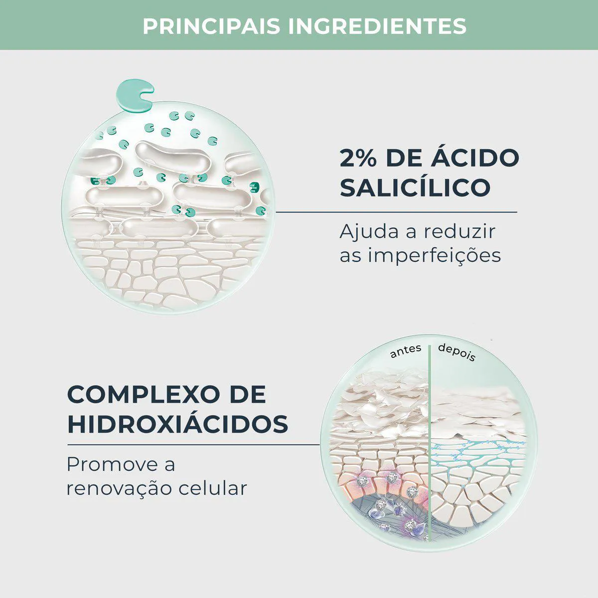 É um gel de limpeza facial concentrado desenvolvido para peles oleosas e acneicas que promove uma limpeza profunda e eficaz. Sua fórmula contém 2% de ácido salicílico que ajuda no controle da oleosidade e também auxilia no combate de cravos e espinhas. Além disso, possui o complexo de hidroxiácidos que promove a renovação celular otimizando a remoção das manchas escuras causadas por acnes.