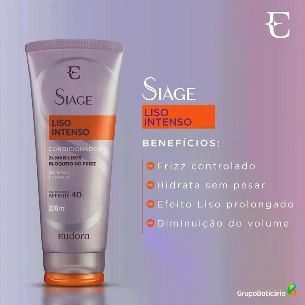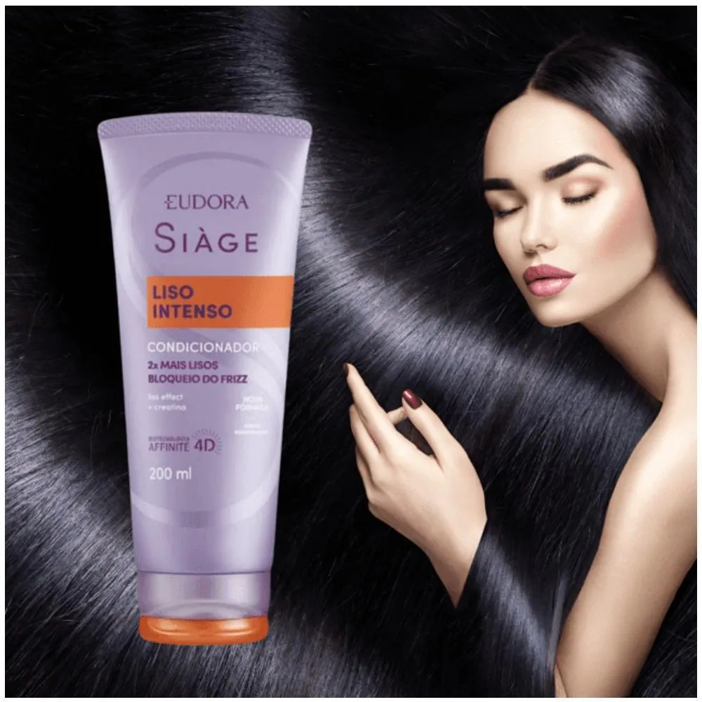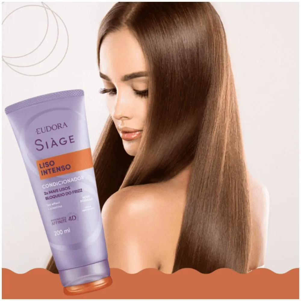 Eudora Siàge Liso Intenso possui fórmula inteligente que se adequa a lisos naturais, alisados ou com ondas indesejadas, proporcionando liso extremo por muito mais tempo. Seus produtos entregam hidratação, cuidados diários, cabelos 2x mais lisos e bloqueio do frizz.