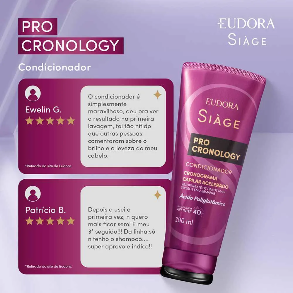 Espalhe o condicionador ao longo dos fios. Desembarace suavemente deixando agir por alguns minutos. Enxágue bem. Siàge Pro Cronology uniu os maiores desejos das consumidoras brasileiras em uma linha de cronograma capilar acelerado de 2 semanas que cabe na sua rotina e recupera até os danos mais severos (desidratado, ressecado e extremamente danificado2).