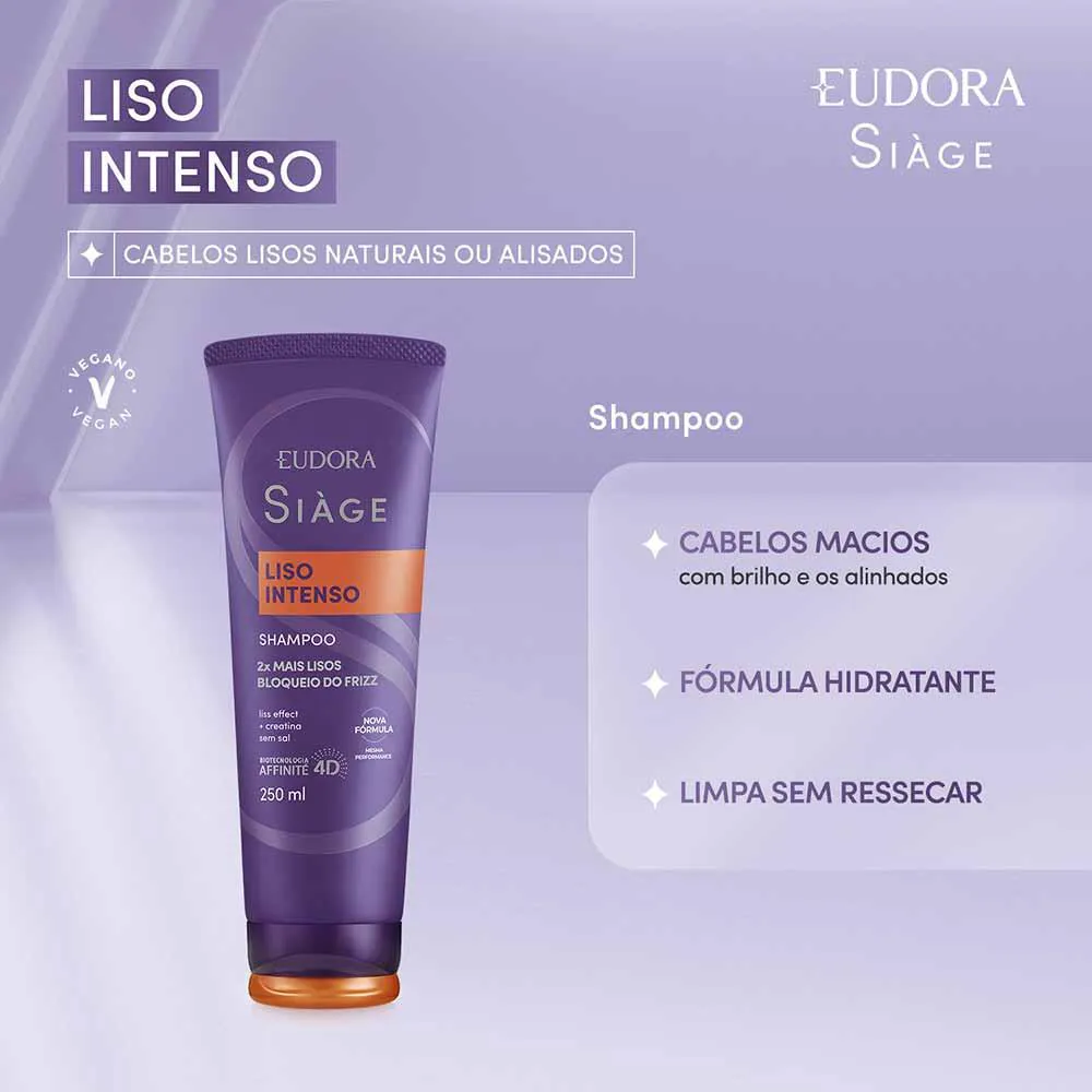 Eudora Siàge Liso Intenso possui fórmula inteligente que se adequa a lisos naturais, alisados ou com ondas indesejadas, proporcionando liso perfeito por muito mais tempo. A proteína creatina, aliada ao complexo Liss Effect, bloqueia os agentes causadores do frizz e de fios indisciplinados, deixando os cabelos hidratados, macios e com muito brilho. Protege do calor do secador e chapinha por até 230º.