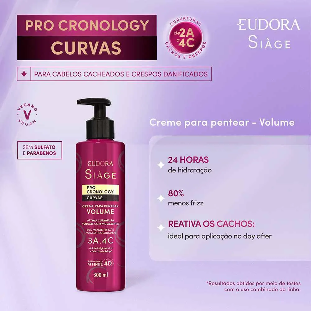 Descubra o poder transformador do Eudora Siàge Pro Cronology Curvas Volume Creme de Pentear, um verdadeiro aliado para quem busca cabelos cacheados e crespos sempre impecáveis. Este creme para pentear foi especialmente formulado para proporcionar maciez e movimento às suas madeixas, desde a finalização até o day after, atendendo com precisão às necessidades das curvaturas do tipo 3A ao 4C. Um produto de tratamento capilar desenhado para oferecer cuidados intensivos a cabelos cacheados e crespos. Este creme proporciona uma finalização perfeita e reativa os cachos, garantindo 24 horas de hidratação. É ideal para ser utilizado tanto na finalização após a lavagem quanto no day after, mantendo seus fios definidos e com menos frizz. Com a exclusiva Biotecnologia Affinité 4D, ele detecta os danos nos fios e libera os ativos gradualmente, promovendo um tratamento profundo e duradouro.