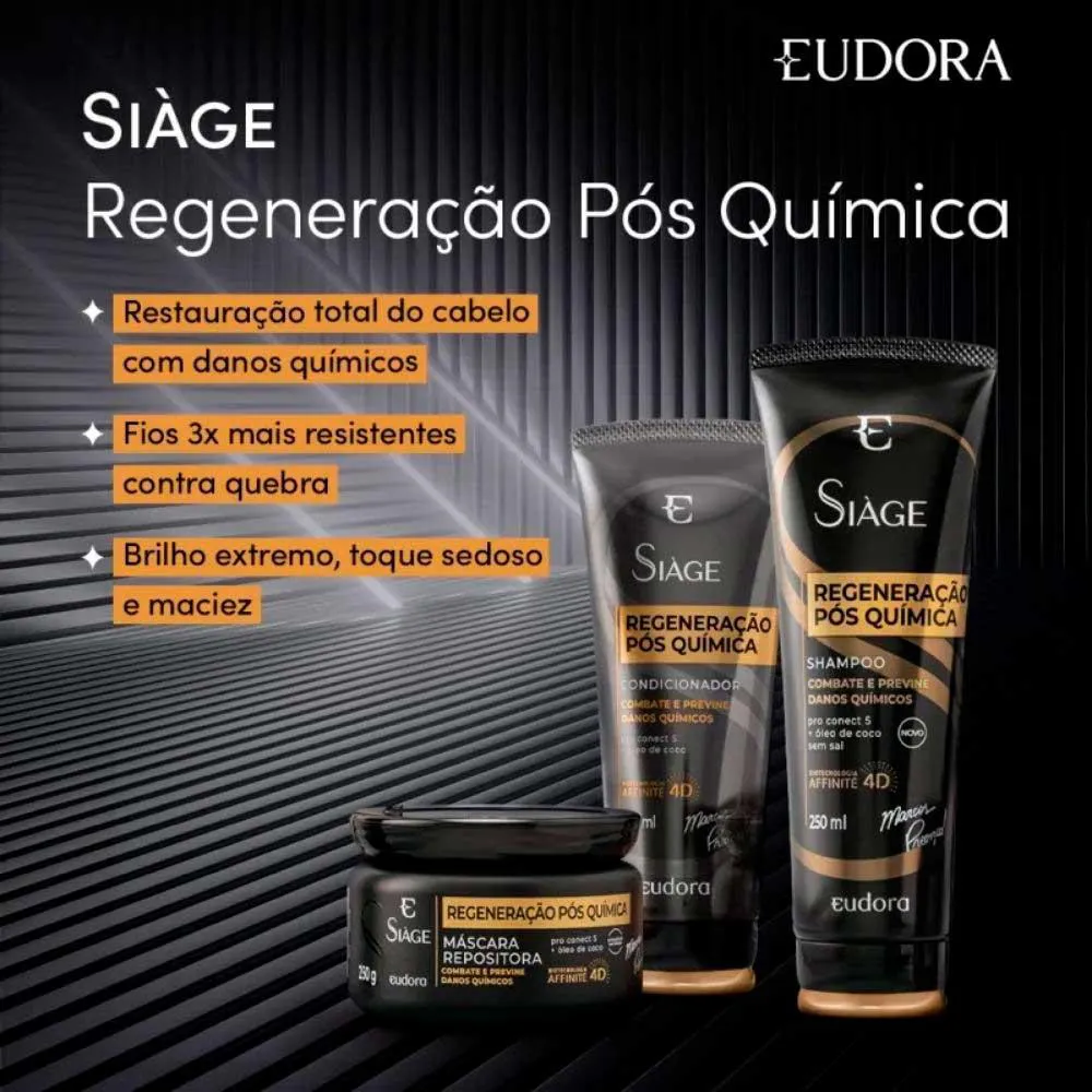 O Shampoo Siàge Expert Regeneração Pós Química é um tratamento capilar desenvolvido especificamente para regenerar fios danificados por procedimentos químicos. Ele utiliza a tecnologia Pro Conect 5 e óleo de coco para restaurar a saúde, resistência e brilho dos cabelos, atuando no religamento das pontes capilares.
