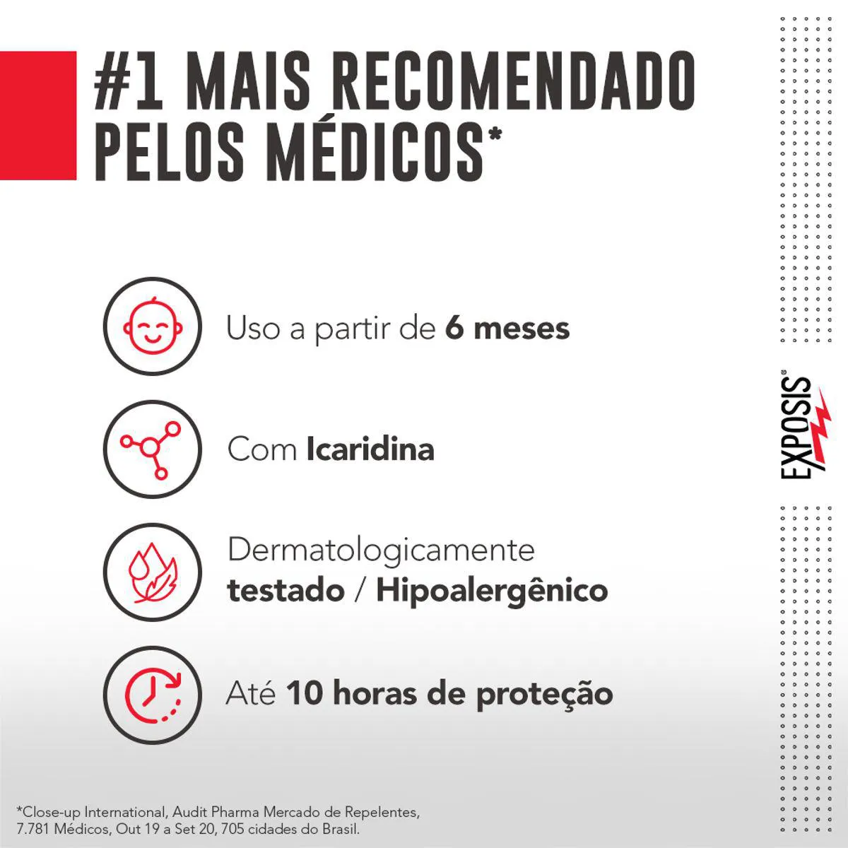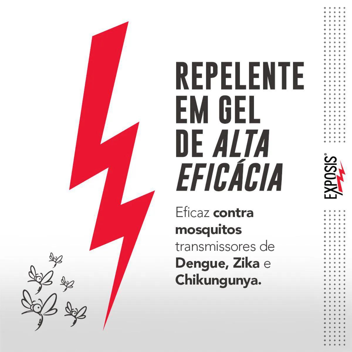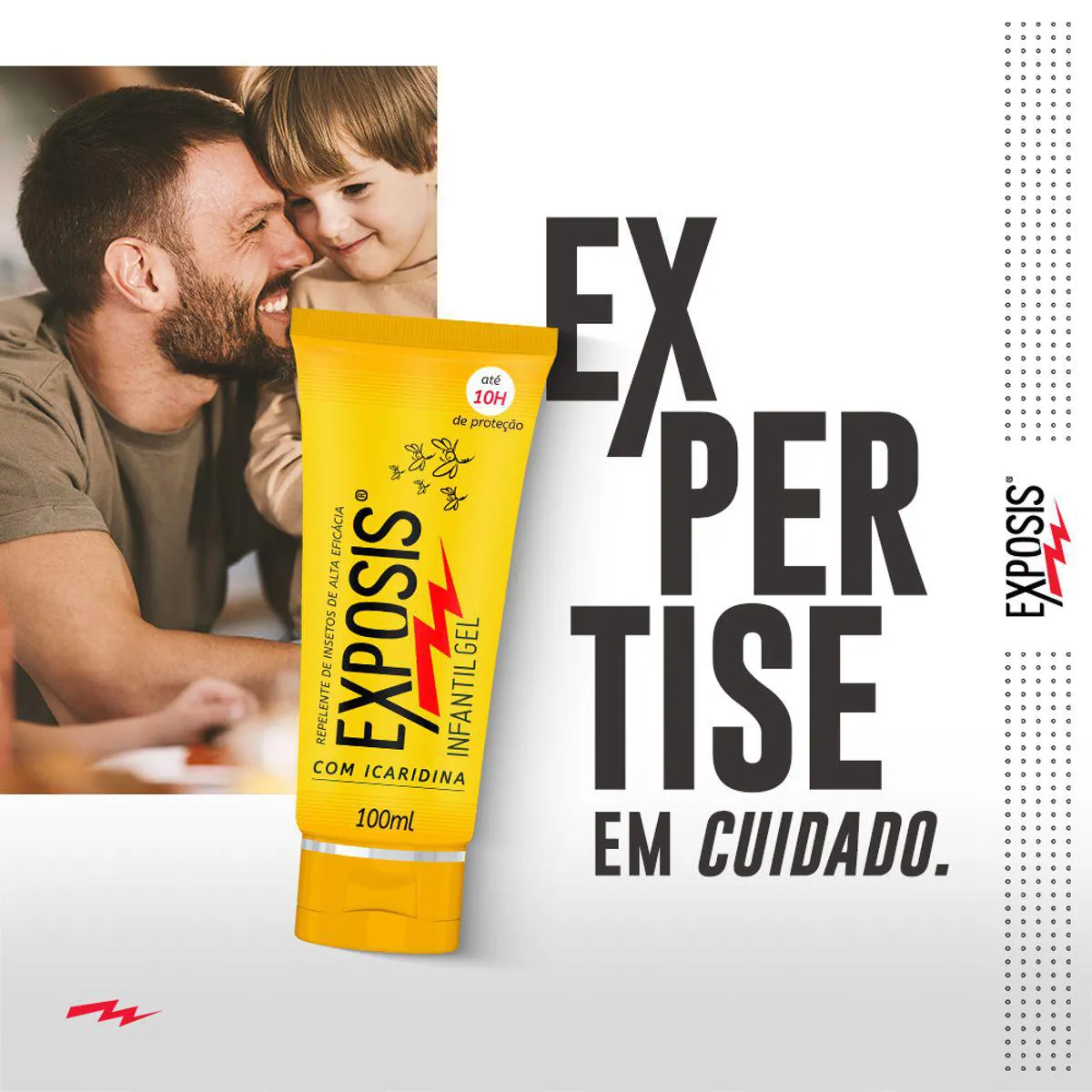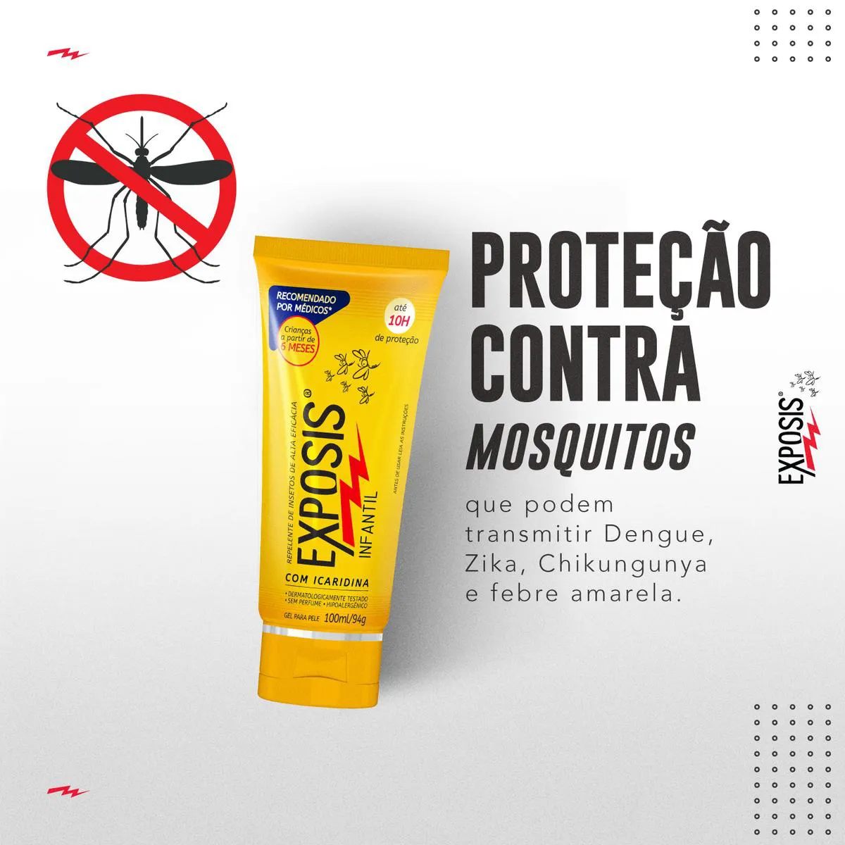 Exposis Infantil é um repelente em gel desenvolvido especialmente para proteger a pele das crianças. Possui alta eficácia contra picadas de insetos transmissores de vírus, entre os quais a dengue, a zika e a chikungunya, que podem transmitir doenças e causar irritações na pele. Com 20% de icaridina (substância hipoalergênica reconhecidamente eficaz na proteção contra insetos), Exposis Infantil oferece até 10 horas de proteção diária, se usado corretamente. É dermatologicamente testado e hipoalergênico, diminuindo as chances de possíveis irritações ou alergias.