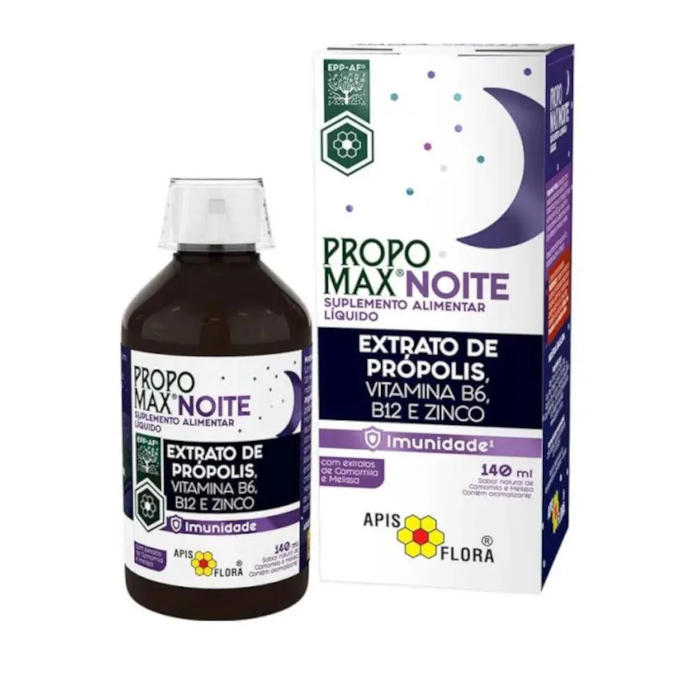 O Propomax Noite é um extrato de própolis com zinco e vitaminas B6 e B12, uma ótima maneira de fortalecer sua imunidade. Sua fórmula contém extratos de camomila e melissa, além de mel, contribuindo para que você termine bem o seu dia.