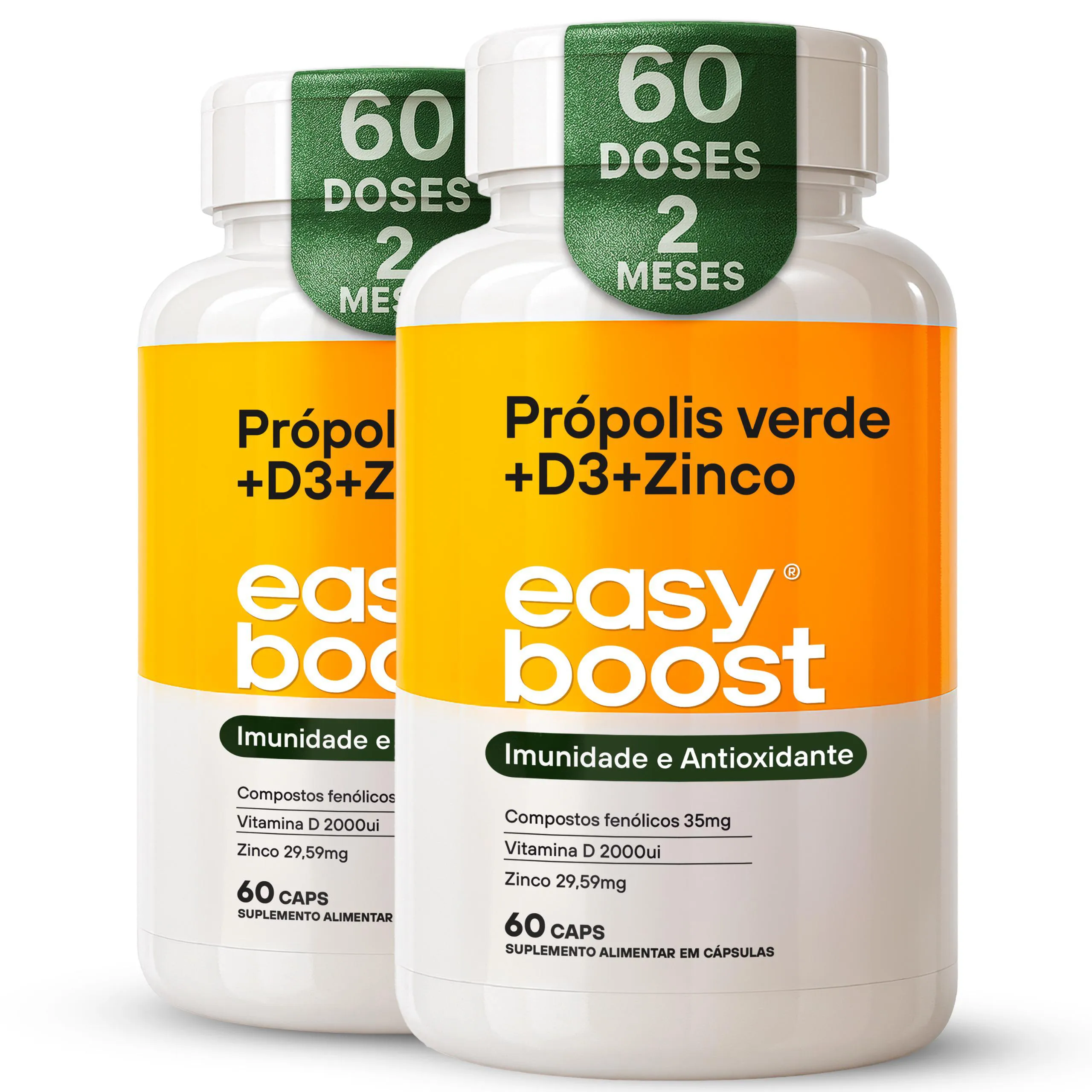 Neste anúncio você irá adquirir 2 potes de Extrato de Própolis Verde + vitamina D3 + Zinco Easy Boost com 60 cápsulas cada, total 120, com uma validade longa, de no minímo 12 meses.