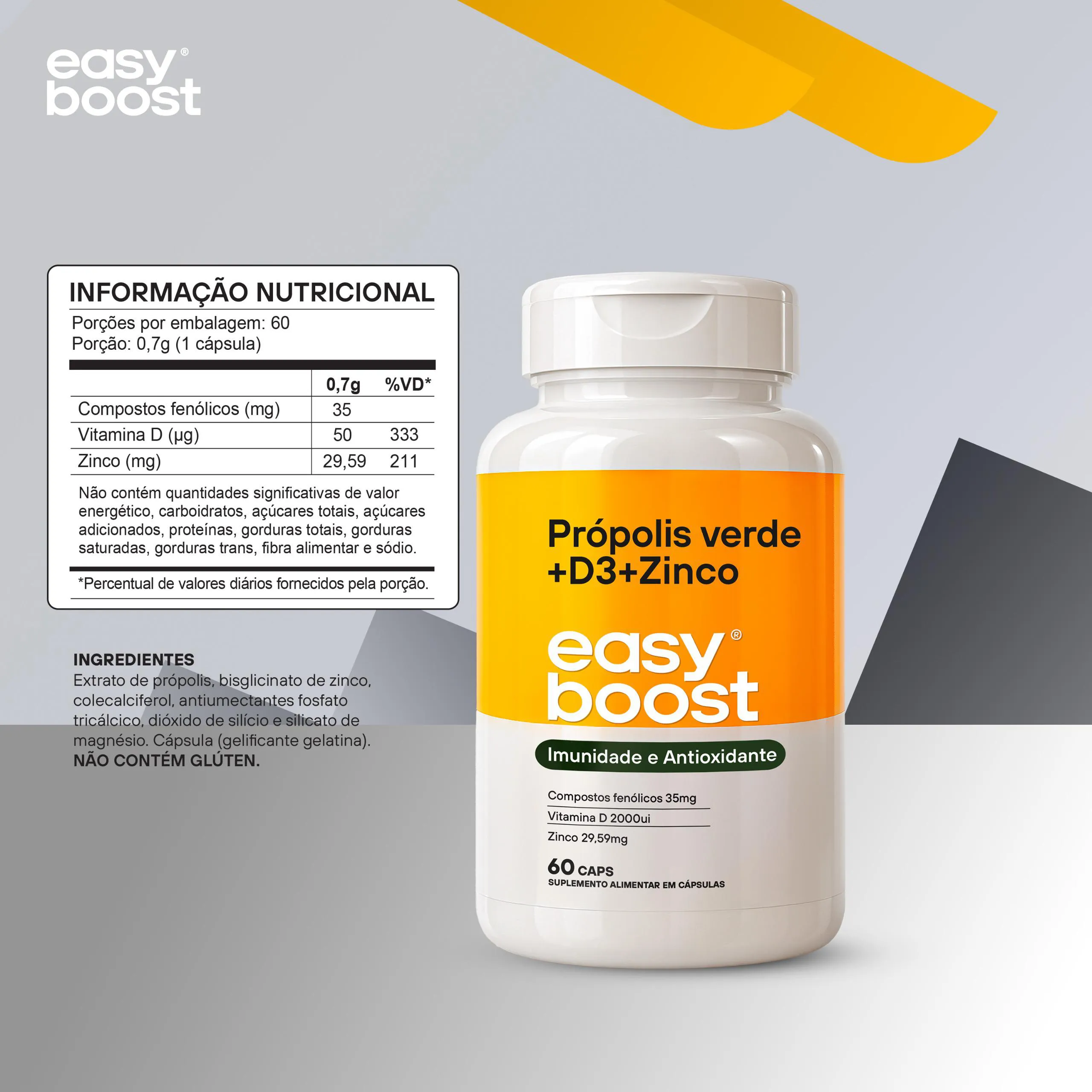 Ingredientes: Extrato de Própolis Verde, Bisglicinato de Zinco, Coleralciferol, Antiumectantes fosfato tricálcico, dióxido de silicio, silicato de magnesio.