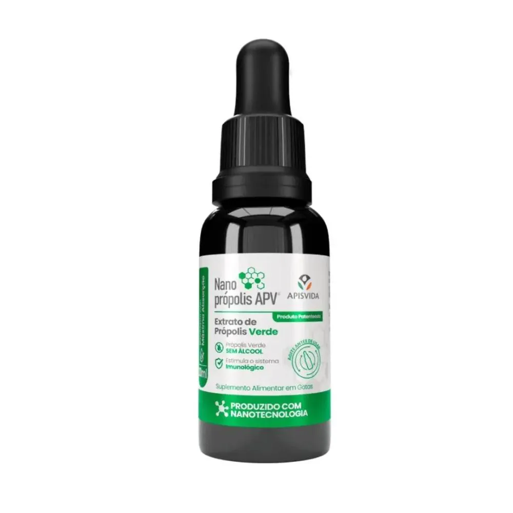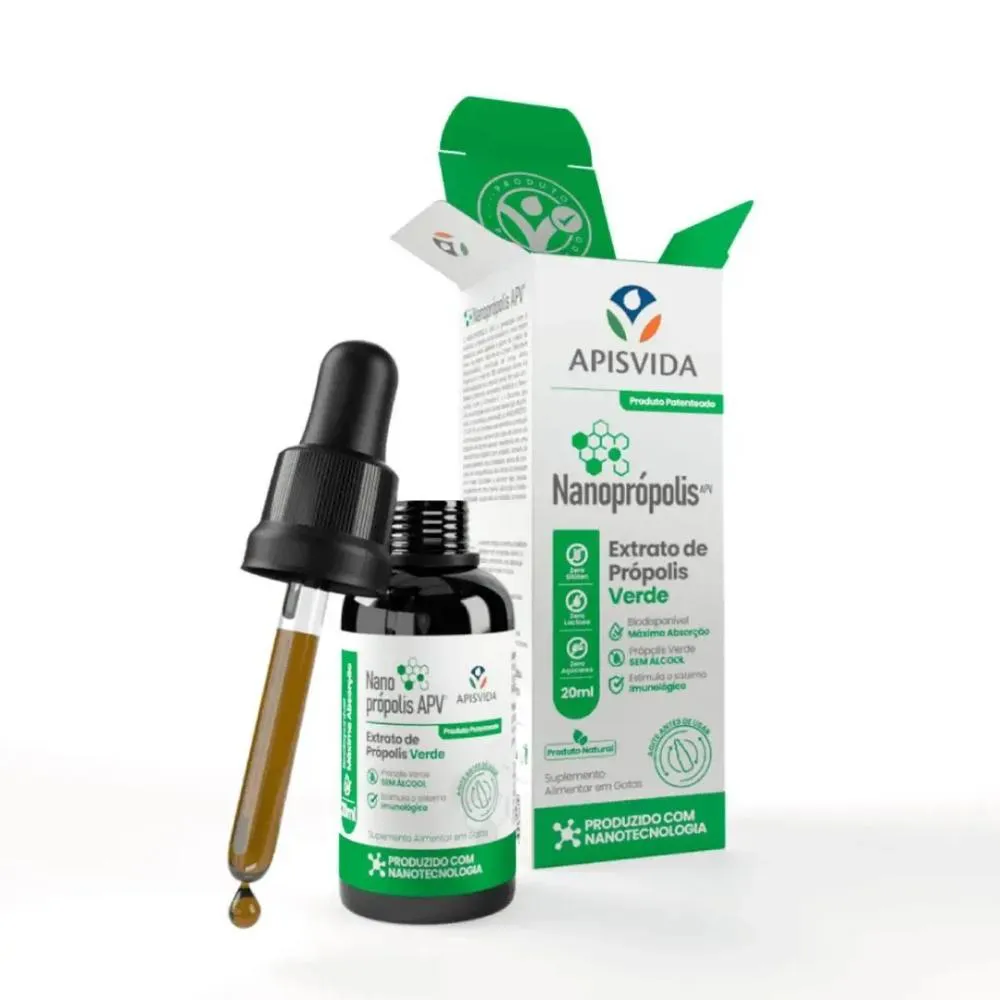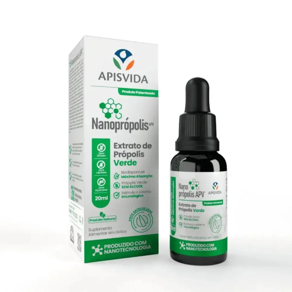 Nanoprópolis é a evolução da própolis verde, com 20ml oferecendo proteção e cuidado para sua saúde. Sua fórmula inovadora, desenvolvida com nanotecnologia patenteada pela APV que encapsula 99% dos seus ativos em nanopartículas, garante uma absorção até 20x superior à própolis tradicional, proporcionando benefícios excepcionais para o seu organismo.