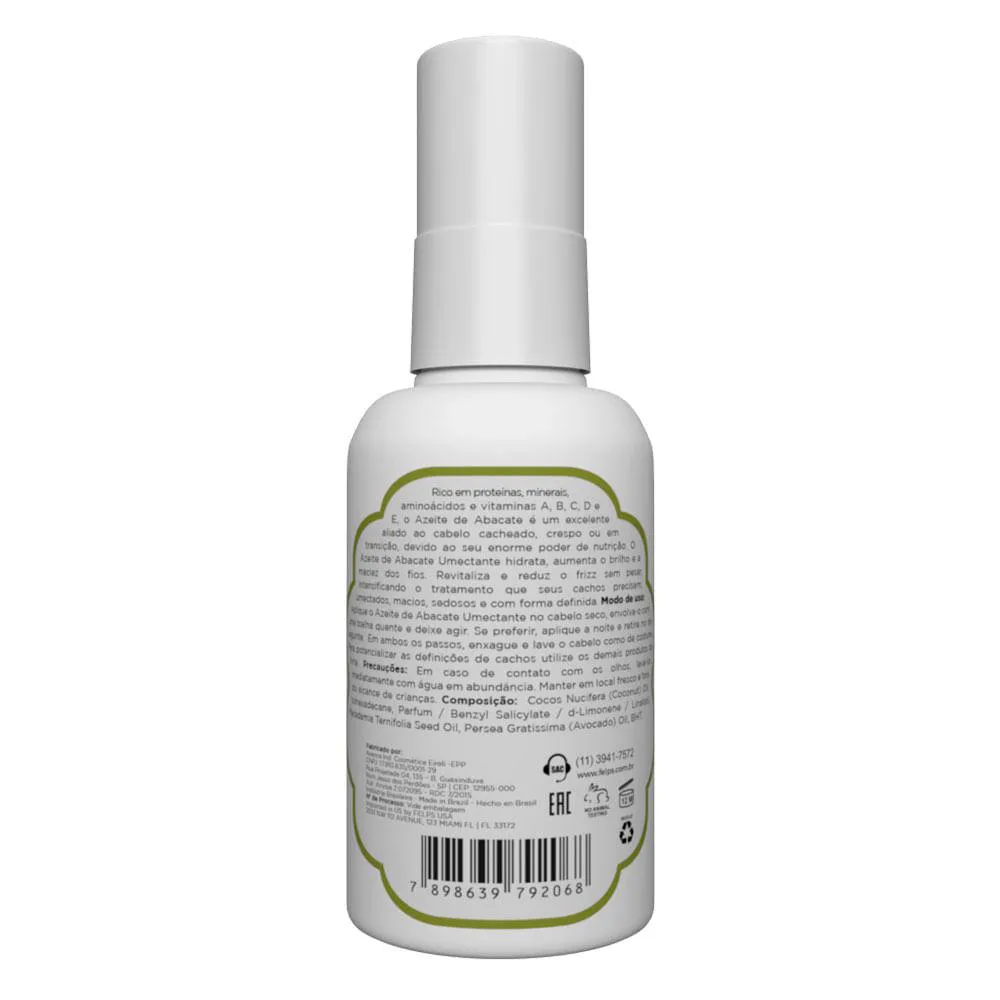 Rico em proteínas, aminoácidos, minerais e vitaminas A, B, C, D e E, o Azeite de Abacate Felps é um excelente aliado ao cabelo cacheado, crespo ou em transição, devido ao seu enorme poder de nutrição. O Umidificador Azeite de Abacate oferece definição e controla o frizz.