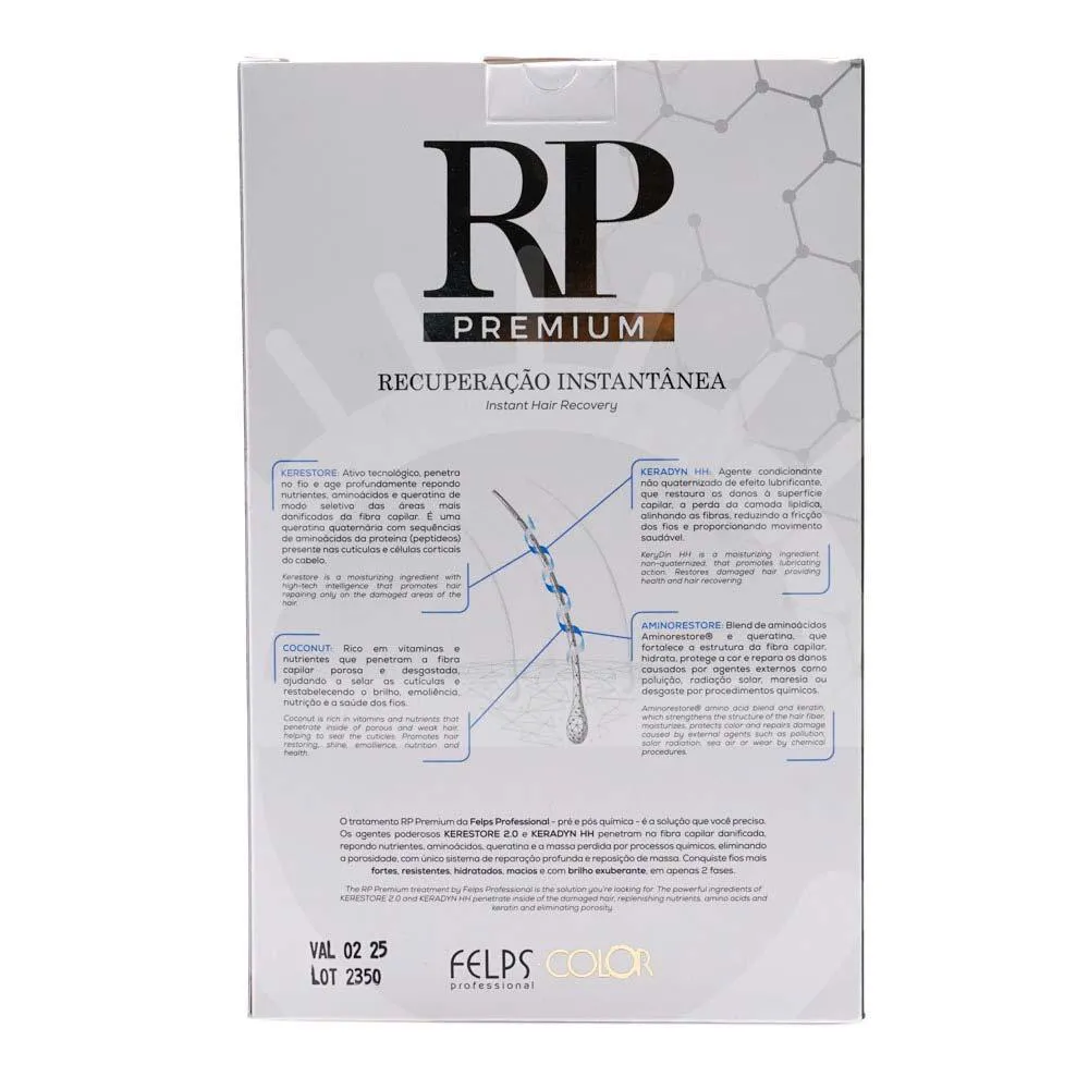 FELPS COLOR RECONSTRUÇÃO PREMIUM SELAMENTO DE CUTICULAS: Tratamento Reconstrutor em 2 PASSOS, desenvolvido especialmente para cuidar de cabelos severamente danificados, ressecados e em processos químicos.