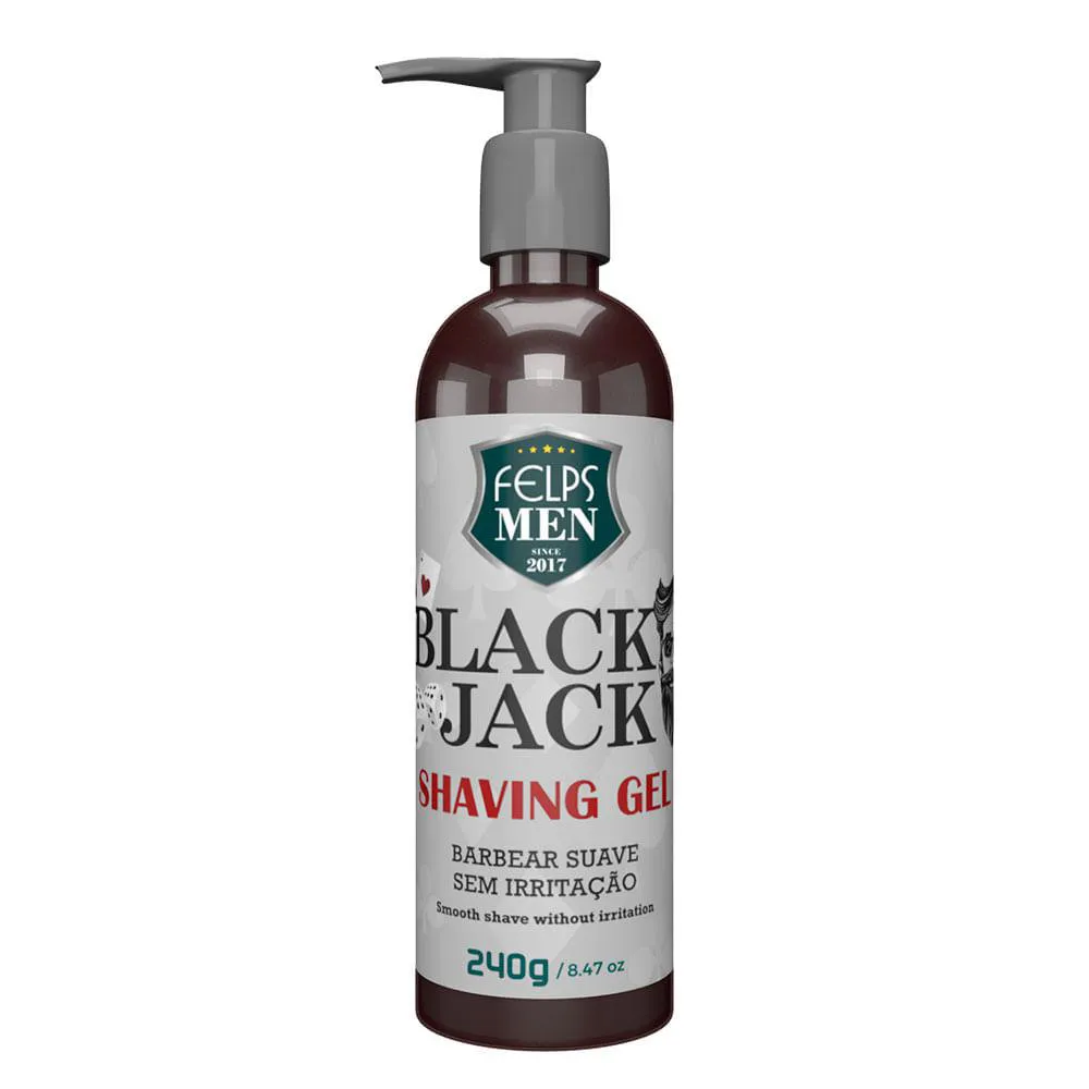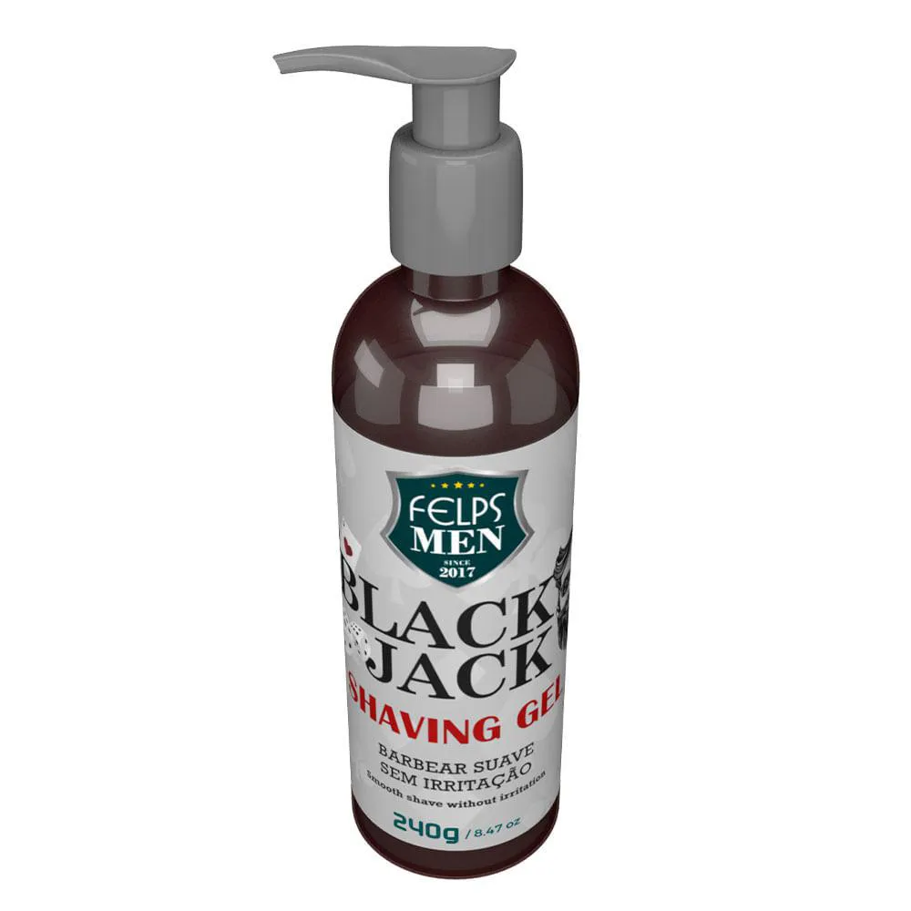 Barbear suave e sem irritação, acabamento perfeito e preciso, contém D´Pantenol que hidrata e acalma a pele./ Gel de barbear. Felps Profissional Men Black Jack Shaving Gel possui fórmula suave, que garante um barbear rente e preciso sem complicações e com irritações reduzidas. Também é perfeito para retirar os pelos de áreas específicas e, assim, dar a forma desejada à barba.