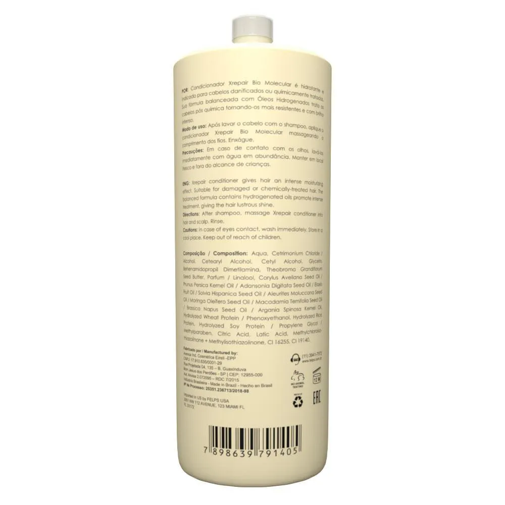 Condicionador Xrepair Bio Molecular é hidratante e indicado para cabelos danificados ou quimicamente tratados. Sua fórmula balanceada com Óleos Hidrogenados trata os cabelos pós química tornando-os mais resistentes e com brilho intenso / Felps Profissional XRepair Bio Molecular.