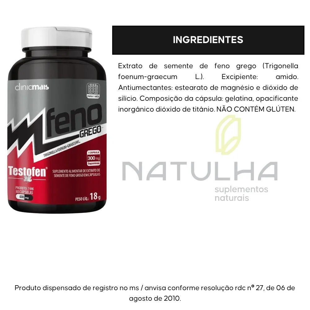 Extrato de semente de feno grego (Trigonella foenum-graecum L.). Excipiente: amido. Antiumectantes: estearato de magnésio e dióxido de silício. Composição da cápsula: gelatina, opacificante inorgânico dióxido de titânio. NÃO CONTÉM GLÚTEN.ANVISA: