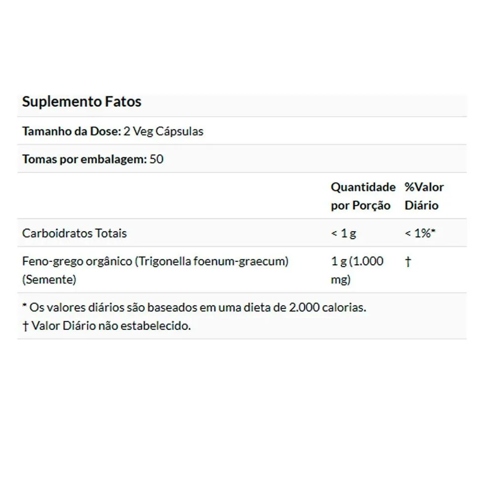 O feno grego pode ser conhecido como fenugreek ou por Trigonella foenum-graecum. Trata-se de uma planta que possui sementes que são utilizadas como tempero comum na culinária indiana. A maior parte de feno grego é produzida na Índia. Há algum tempo atrás a planta e o seu extrato foram disponibilizados no mercado de suplementos de musculação, o que foi utilizado como fundamento para novos estudos serem realizados com a finalidade de comprovar que o fenugreek pode ser utilizado para inúmeros benefícios incluindo um melhor condicionamento físico. O feno-grego é uma das ervas mais antigas tradicionalmente usadas na Grécia, Egito e China na antiguidade. Vem sendo usado em uma variedade de formas e pode ser adicionado à água quente para fazer chá. Uso Sugerido Tome 2 cápsulas, de 1 a 3 vezes ao dia. Outros Ingredientes Celulose (cápsula), ácido esteárico (fonte vegetal), estearato de magnésio (fonte vegetal) e sílica. Não fabricado com ingredientes de levedura, trigo, glúten, soja, leite, ovo, peixe, marisco ou nozes. Produzido em uma instalação GMP que processa outros ingredientes que contenham esses alérgenos. Advertências Apenas para adultos. Não recomendado para mulheres grávidas. Consulte um médico caso esteja amamentando, tomando medicamentos ou tenha problemas médicos. Mantenha fora do alcance de crianças. Poderá ocorrer alteração natural na coloração do produto. Depois de aberto, armazene em local seco e arejado. Produto isento de registro conforme RDC 27/08/2010