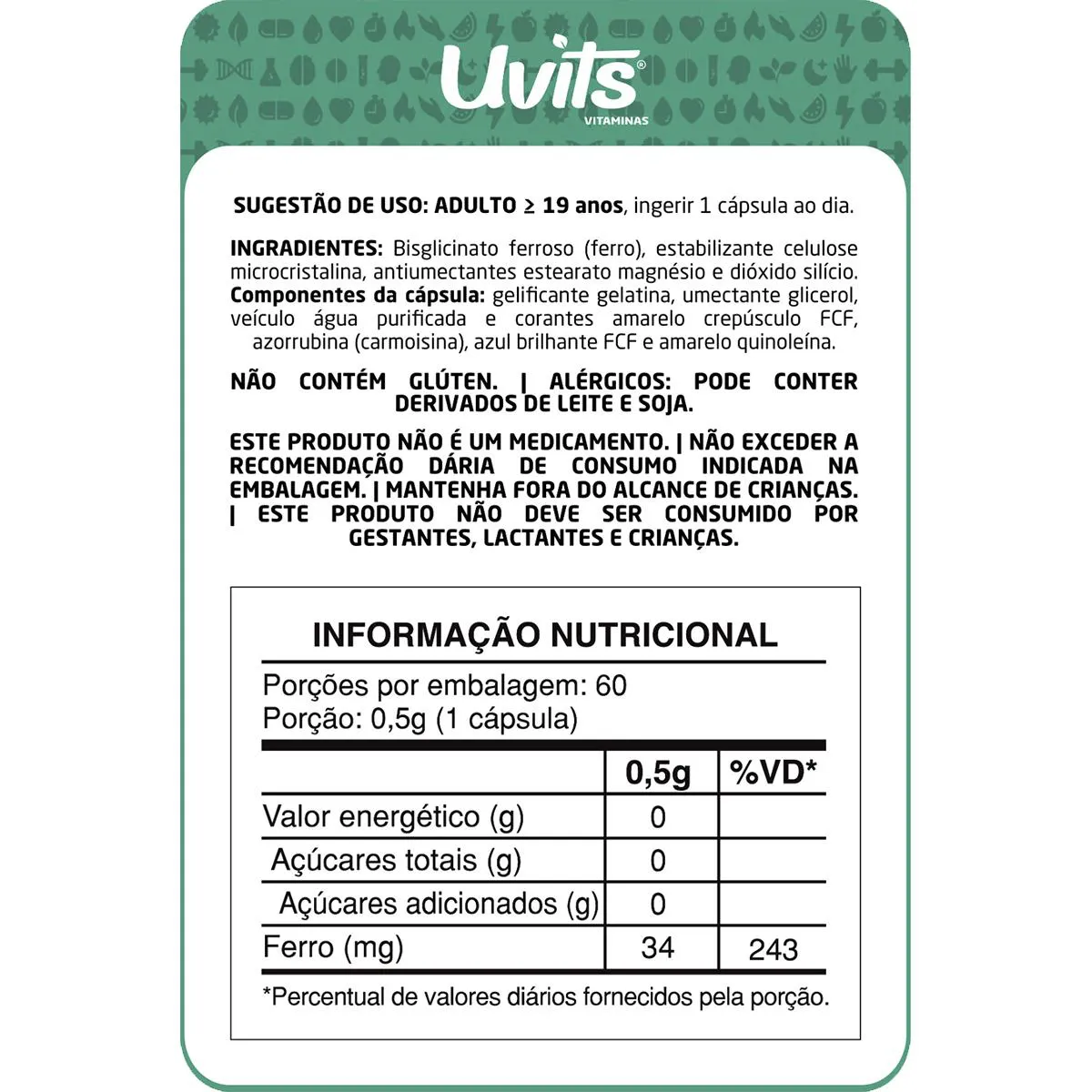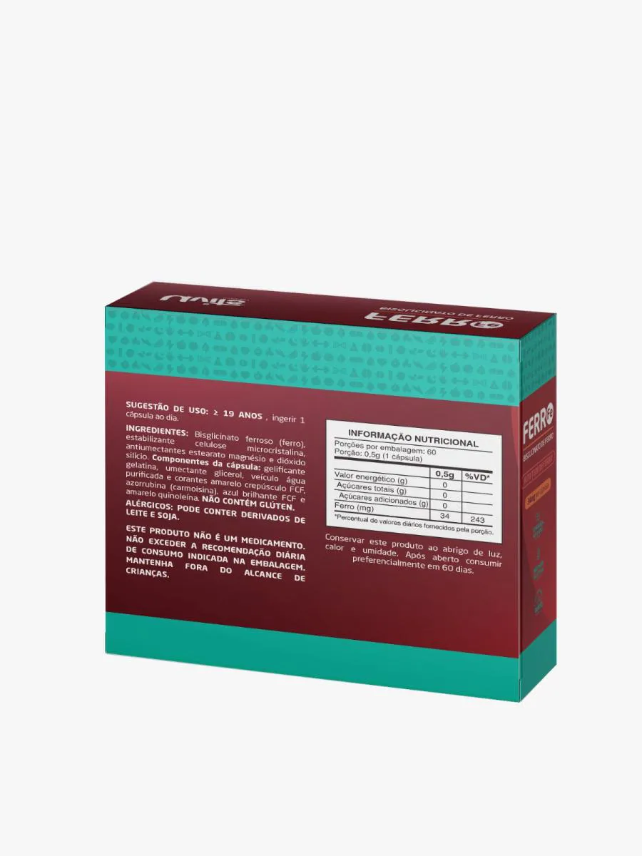 INGREDIENTES: Bisglicinato ferroso ( ferro ), estabilizante celulose microcristalina, antiumectantes estearato de magnésio e dióxido de silício. Componentes da cápsula: gelificante gelatina, umectante glicerina, veículo água purificada e corante amarelo crepúsculo FCF, azorrubina (carmoisina), azul brilhante FCF e amarelo quinoleína. NÃO CONTÉM GLÚTEN