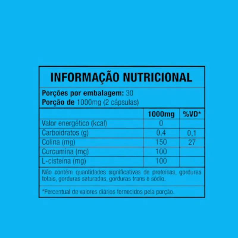 Bitartrato de colina, extrato de rizomas de cúrcuma longa, N-acetil L-cisteína, antiumectante dióxido de silício, excipiente amido de milho.