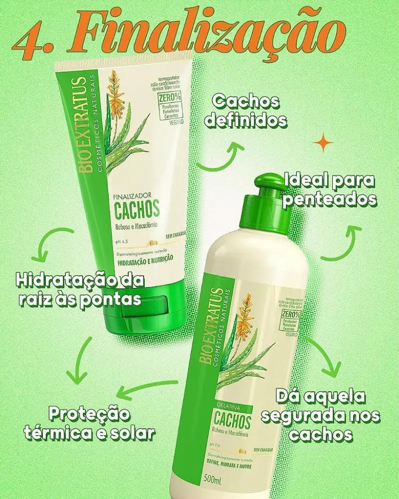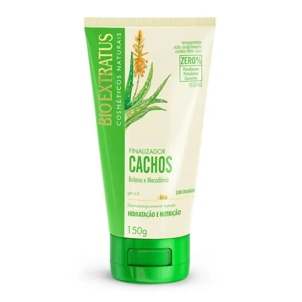 finalizador BIO EXTRATUS CACHOS BABOSA E MACADAMIA 150G Ajuda na definição enquanto nutre os fios. Protege os cabelos e proporciona muito mais brilho e maciez. A babosa é um excelente hidratante e a macadâmia oferece nutrição intensa, tratando os cachos em profundidade. Zero% parabenos / petrolatos / corantes. pH 4,5.
