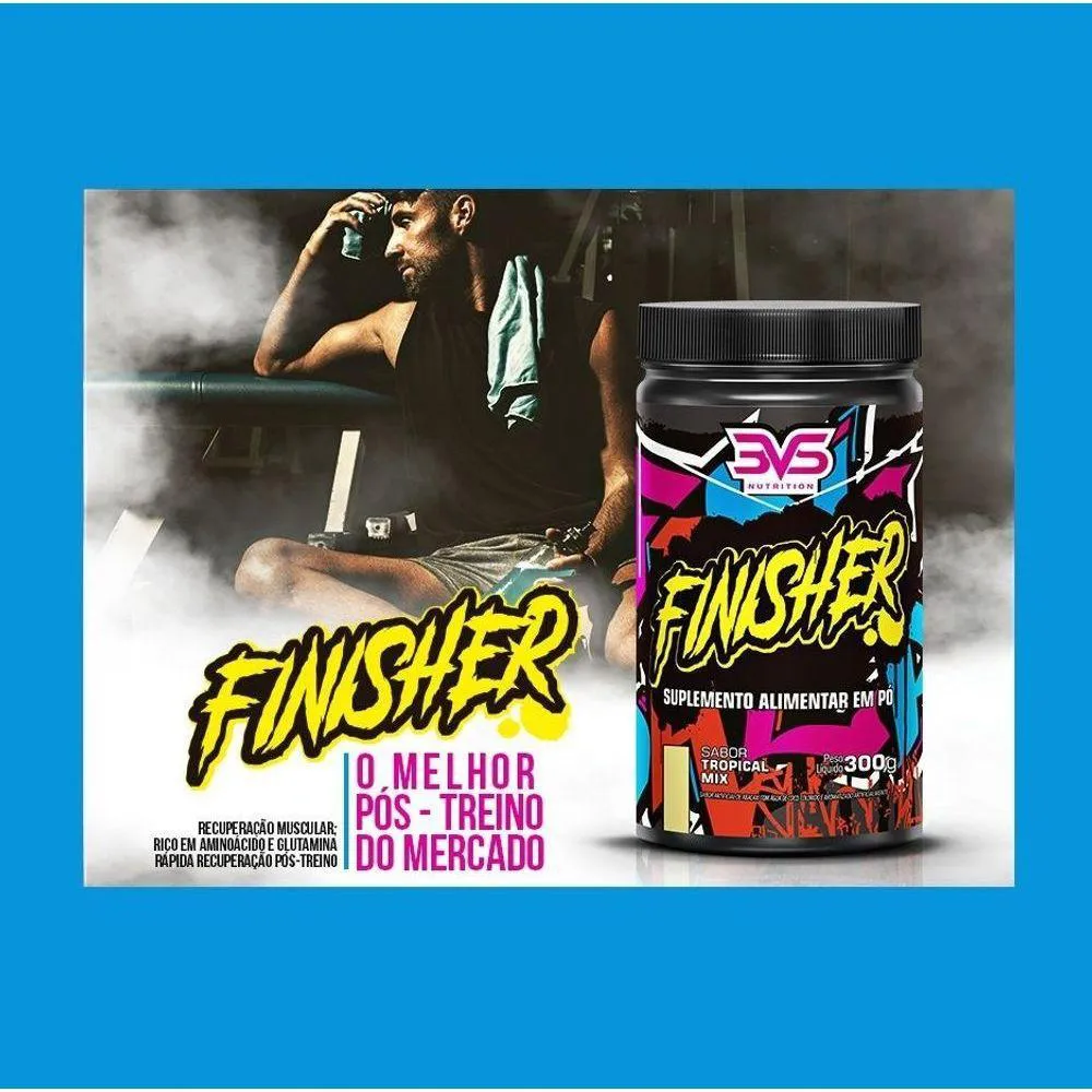 Finisher (300g) - 3VS O Finisher é o suplemento ideal para consumir intra treino ou pós treino, pois o mesmo evita a fadiga, sensação de cansaço, fraqueza, dor ou queda de desempenho durante e após os treinos. O produto foi desenvolvido com aminoácidos de cadeia ramificada L-glutamina, L-Leucina, L- Isoleucina, L-Valina, L-Alanina, Taurina e Picolinato de cromo que auxiliam no processo de recuperação muscular. BENEFÍCIOS * auxilia no processo de recuperação muscular; * evita fadiga; * fornece energia; * rico em aminoácidos e glutamina.