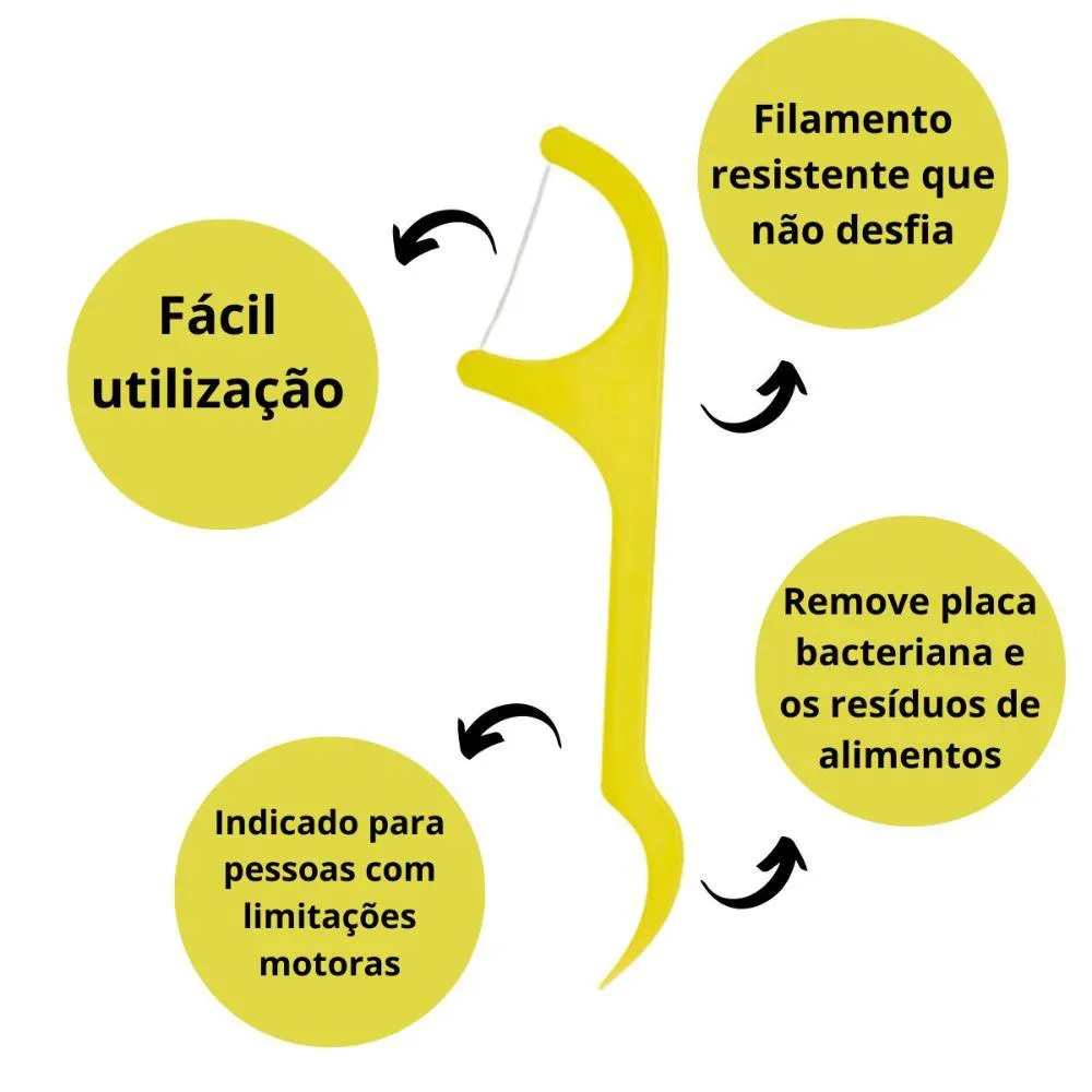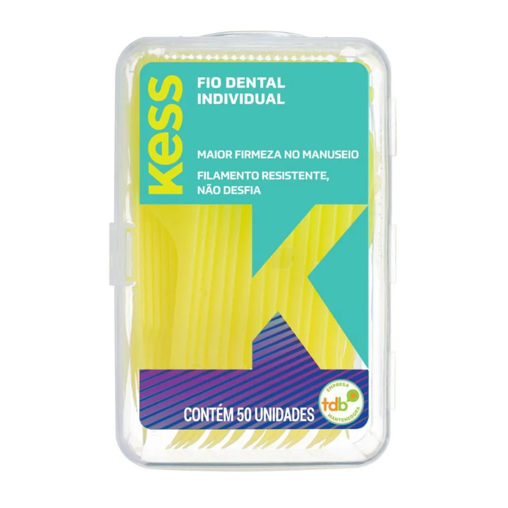 fio dental Kess Individual O Fio Dental Individual Kess é composto de uma pequena haste plástica com uma ponta curva que segura um pedaço de fio dental. Na sua outra extremidade, ele possui uma ponta afinada, que pode ser utilizada para auxiliar na remoção de partículas de comidas presas nos espaços interdentais ou na linha da gengiva. Por ser de fácil utilização, é indicado também para pessoas com limitações motoras. O Fio Dental Individual Kess possui filamento resistente que não desfia. . Função O uso do Fio Dental é indispensável para saúde bucal. Ele remove placa bacteriana e os resíduos de alimentos das áreas onde a escova dental não consegue acessar, evitando doenças na gengiva, como a gengivite, e o surgimento das cáries. . Diferencial Um pedaço de fio é acoplado em uma pequena haste plástica, dando maior firmeza no manuseio. Filamento resistente, não desfia!